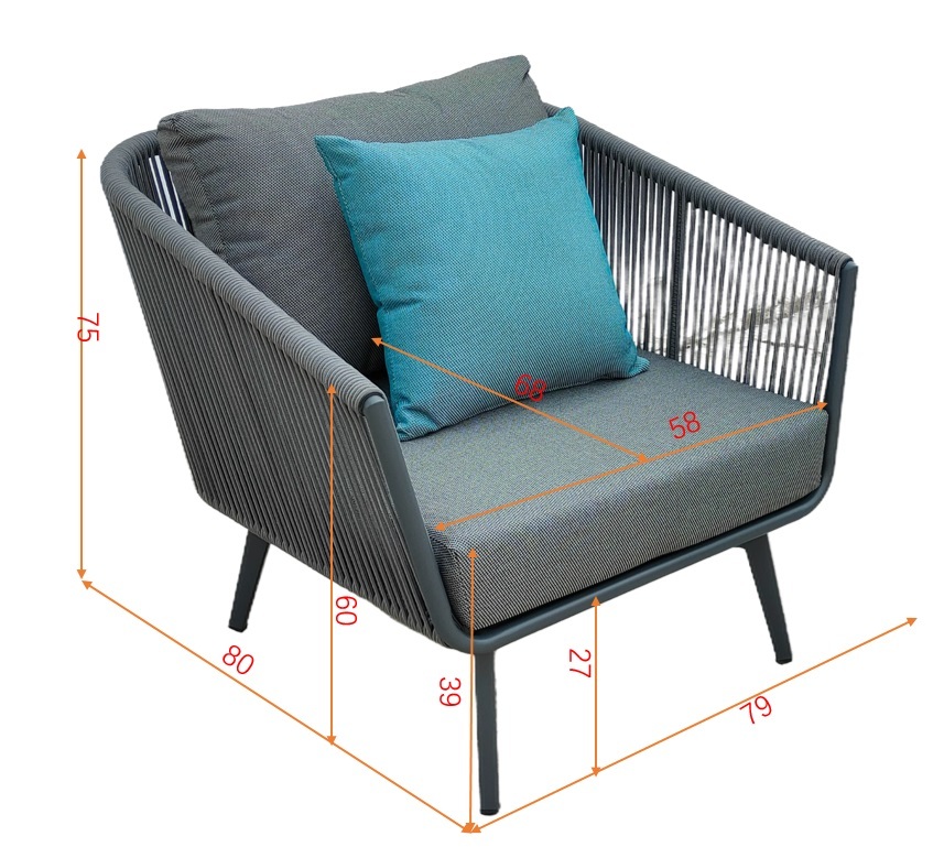 Уличное кресло изготовлено из устойчивых к погодным условиям материалов. Cъемные подушки выполнены из специальной уличной ткани с водоотталкивающими свойствами OLEFIN тайваньского производства. Волокна пропитаны пигментами с высокой устойчивостью к ультрафиолетовому излучению, что предохраняет ткани от выцветания и разрушающего воздействия солнечных лучей.. Каркас из алюминия серого цвета, подлокотники и спинка оплетены декоративным шнуром. В комплект входит подушка сиденья 12см, подушка спинки и 1 декоративная квадратная подушка. Габариты сиденья: ширина 58см, глубина 68см, высота от пола - 39см, высота подлокотника от 20см. Сочетается с уличным диваном 129KN-02613 и кофейными столиками 129KN-01430, 129KN-00620.