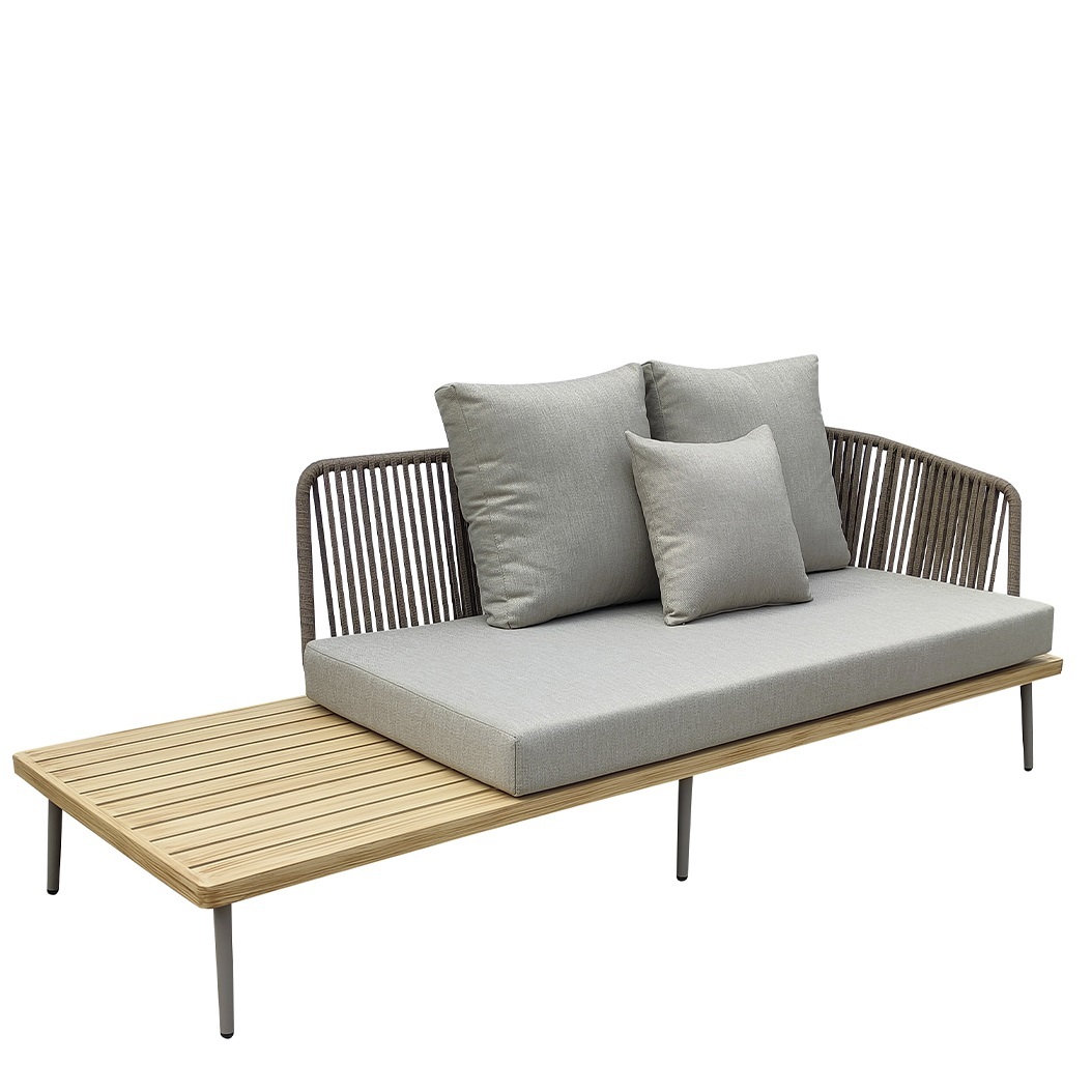 Уличный диван изготовлен из устойчивых к погодным условиям материалов. Cъемные подушки выполнены из специальной уличной ткани с водоотталкивающими свойствами OLEFIN тайваньского производства. Светлая ткань не будет сильно нагреваться на солнце и выцветать. Каркас из алюминия декорирован в цвет дерева, подлокотники и спинка оплетены декоративным шнуром. Особенность дивана в том, что сиденье не полностью закрывает основание, есть возможность сервировать закуски и напитки, либо положить полотенце и принадлежности для купания. Эта модель выпускается в правом и левом исполнении. В комплект входит подушка сиденья 12см, 2 подушки спинки и 1 декоративная квадратная подушка. Габариты сиденья: ширина 157см, глубина 71,5см, высота от пола 40 см, высота подлокотника от сиденья 27см. Сочетается с уличным креслом 129KN-03041, диванами 129KN-03042, 129KN-03047 и кофейными столиками 129KN-01430, 129KN-00620.