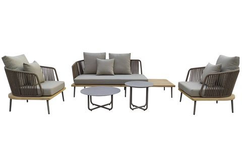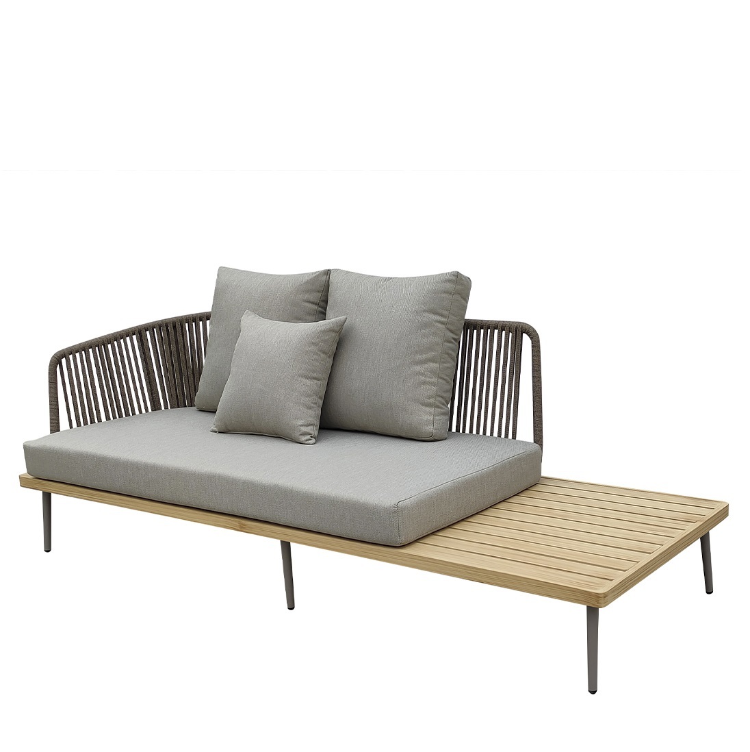 Уличный диван изготовлен из устойчивых к погодным условиям материалов. Cъемные подушки выполнены из специальной уличной ткани с водоотталкивающими свойствами OLEFIN тайваньского производства. Светлая ткань не будет сильно нагреваться на солнце и выцветать. Каркас из алюминия декорирован в цвет дерева, подлокотники и спинка оплетены декоративным шнуром. Особенность дивана в том, что сиденье не полностью закрывает основание, есть возможность сервировать закуски и напитки, либо положить полотенце и принадлежности для купания. Эта модель выпускается в правом и левом исполнении. В комплект входит подушка сиденья 12см, 2 подушки спинки и 1 декоративная квадратная подушка. Габариты сиденья: ширина 157см, глубина 71,5см, высота от пола 40 см, высота подлокотника от сиденья 27см. Сочетается с уличным креслом 129KN-03041, диванами 129KN-03042, 129KN-03046 и кофейными столиками 129KN-01430, 129KN-00620.