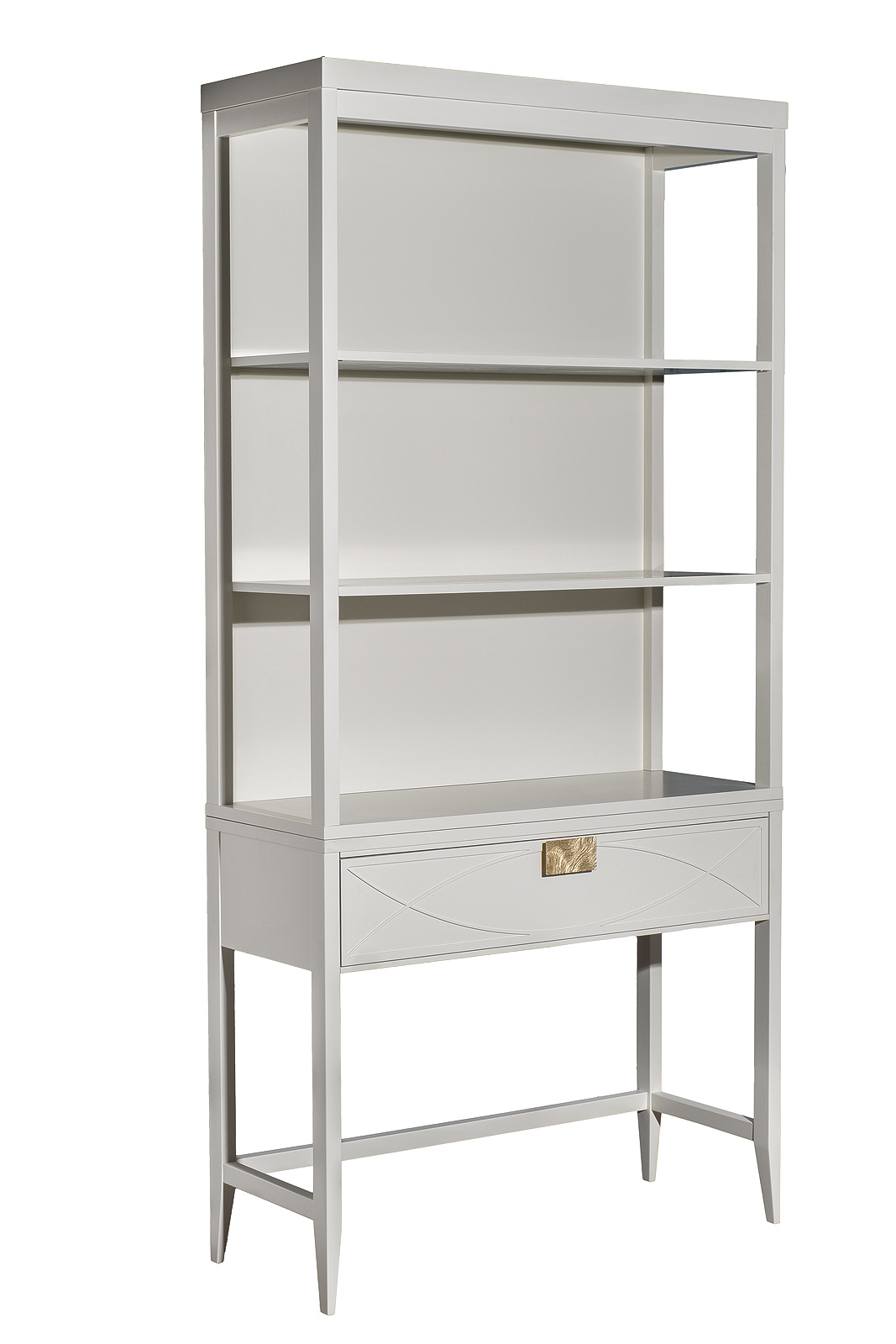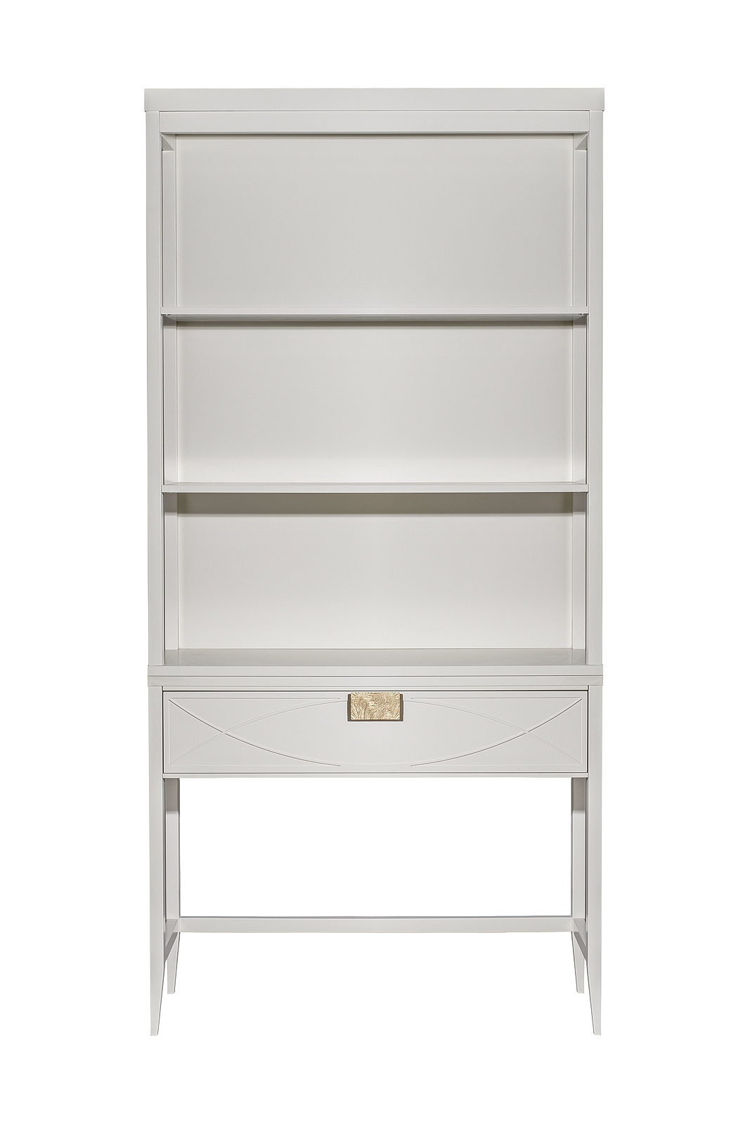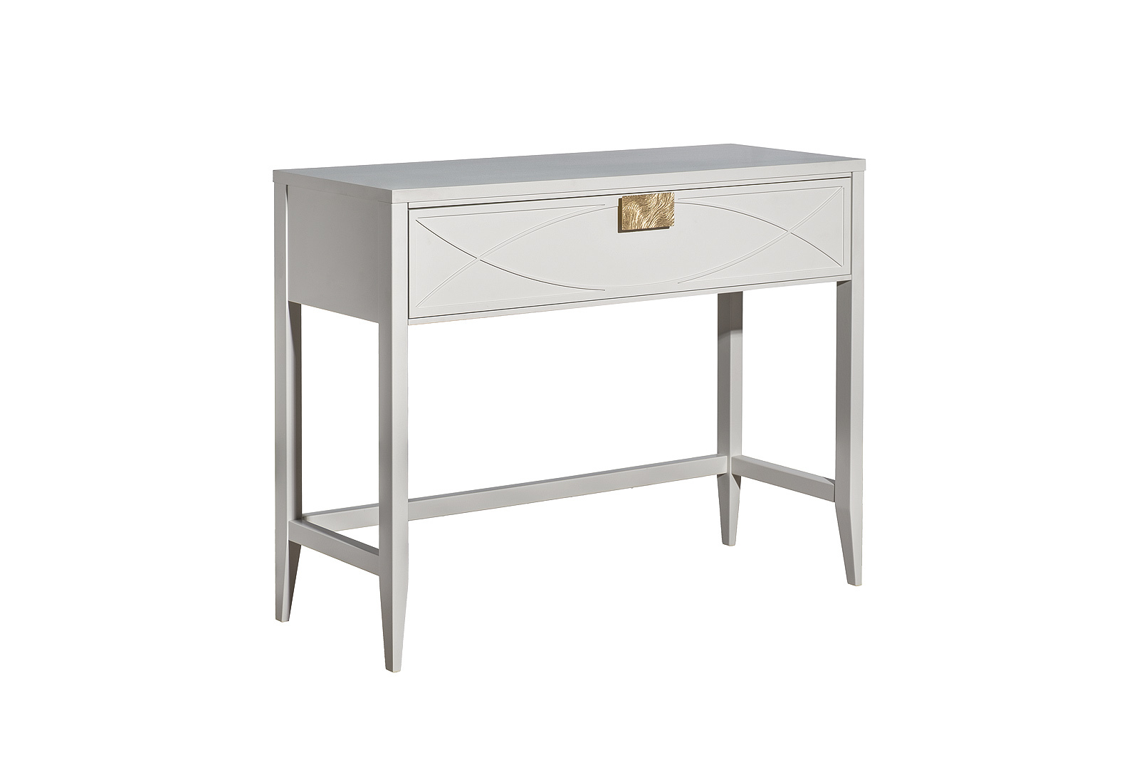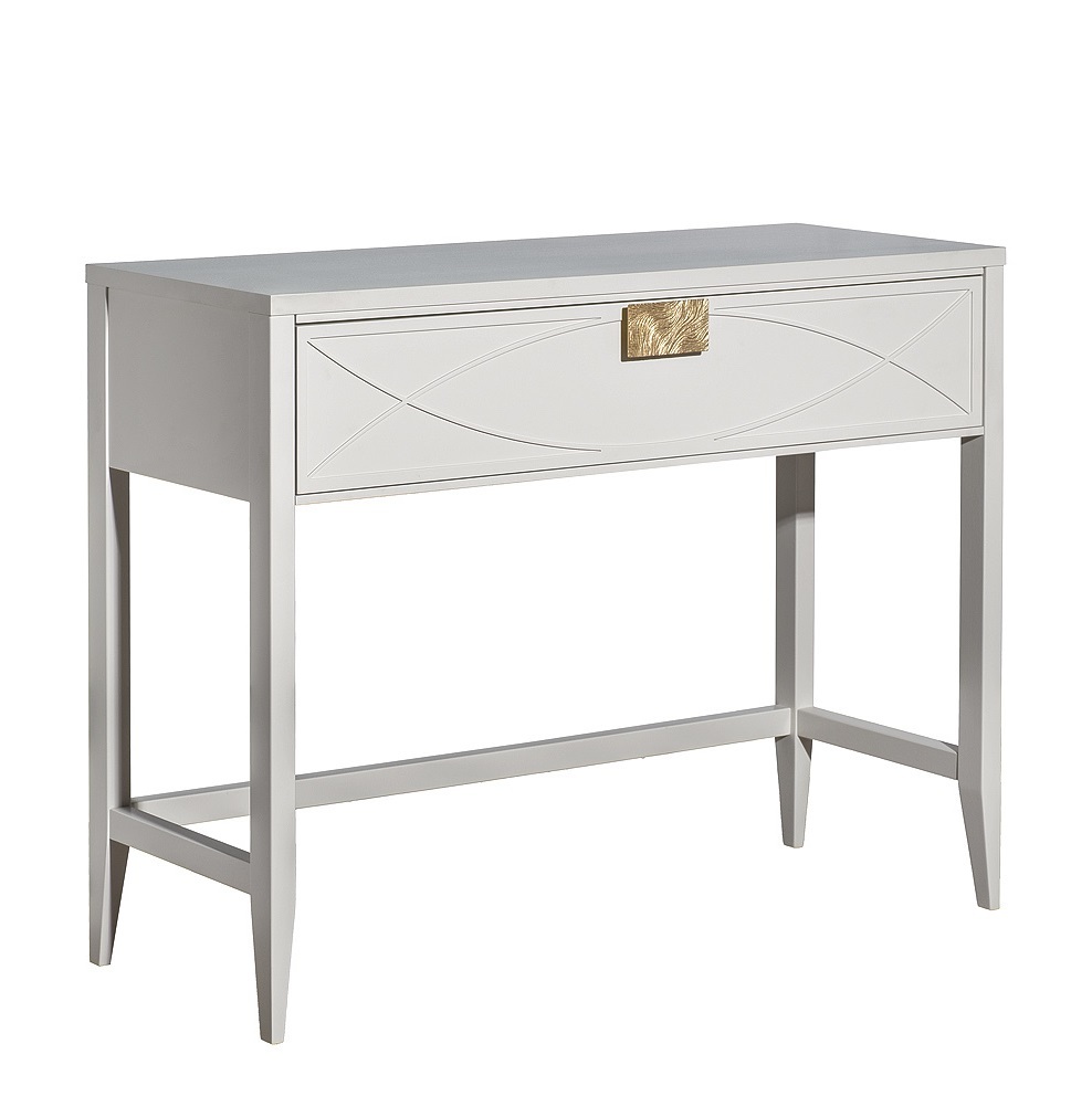 Дизайнерская консоль в стиле ар-деко. Бежевый матовый фасад украшен объемным дугообразным декором и широкими рельефными ручками цвета матовое золото. Выдвижной ящик прекрасно подойдет для хранения щеток, косметики и прочих мелочей. Тонкие ножки придают конструкции легкость и изящество. Эксклюзивная консоль станет гармоничным дополнением интерьера прихожей, спальни или гостиной.