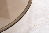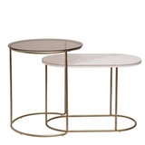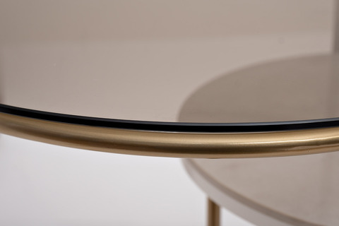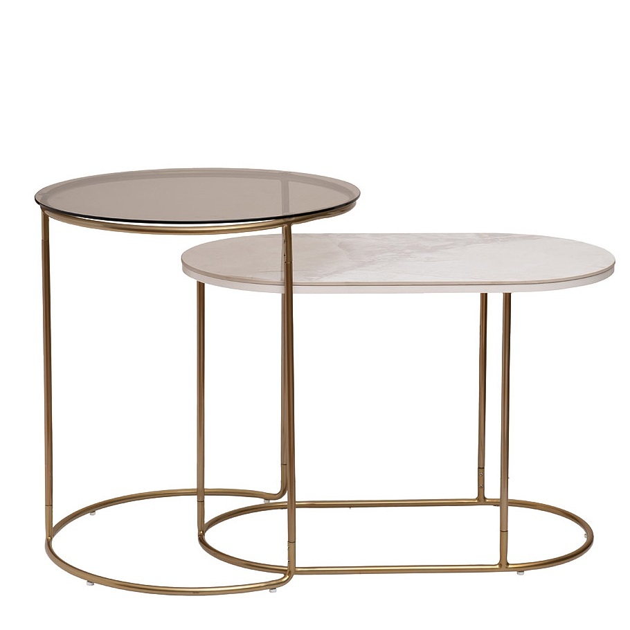 Стильный набор журнальных столов эффектно выглядит в интерьере современной гостиной за счет необычной двойной конструкции. В отличие от традиционного решения, данный комплект журнальных столов более функциональный и вариативный. При необходимости можно получить два столика для сервировки или легко освободить пространство, задвинув овальный стол под круглый. Особенность этой модели – сочетание двух материалов столешниц: закаленного стекла и керамогранита. Две разные фактуры объединяет одинаковое основание из нержавеющей стали с позолотой. За счет такого дизайнерского подхода набор смотрится гармонично и весьма эффектно. Мы предлагаем купить журнальные столы в гостиную с доставкой по Москве и РФ.