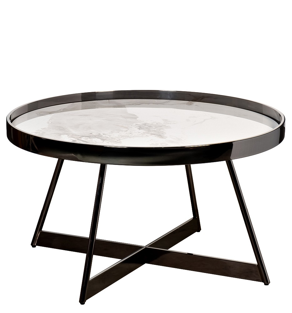 Этот журнальный столик — воплощение смелого диалога между материалами и оттенками. Его идеально круглая столешница из белоснежного керамогранита, вдохновлённого мраморным рисунком с его тонкими, едва уловимыми прожилками, излучает чистоту и легкость. Этот светлый акцент парит над строгим, графичным основанием из нержавеющей стали цвета черного хрома, создавая визуально притягательный контраст. Высокий бортик столешницы не только добавляет функциональности, но и подчеркивает четкость линий, присущую минималистичному дизайну. Тонкие, но прочные ножки, сходящиеся внизу, формируют устойчивую и при этом воздушную конструкцию. Такой дизайнерский столик органично впишется в пространство, где ценятся динамичные сочетания и современная эстетика. Этот объект не просто дополняет интерьер, он активно формирует его характер, привнося баланс утончённого вкуса и актуальных интерьерных трендов через игру света и тени на своих контрастных поверхностях. Толщина столешницы - 10мм.