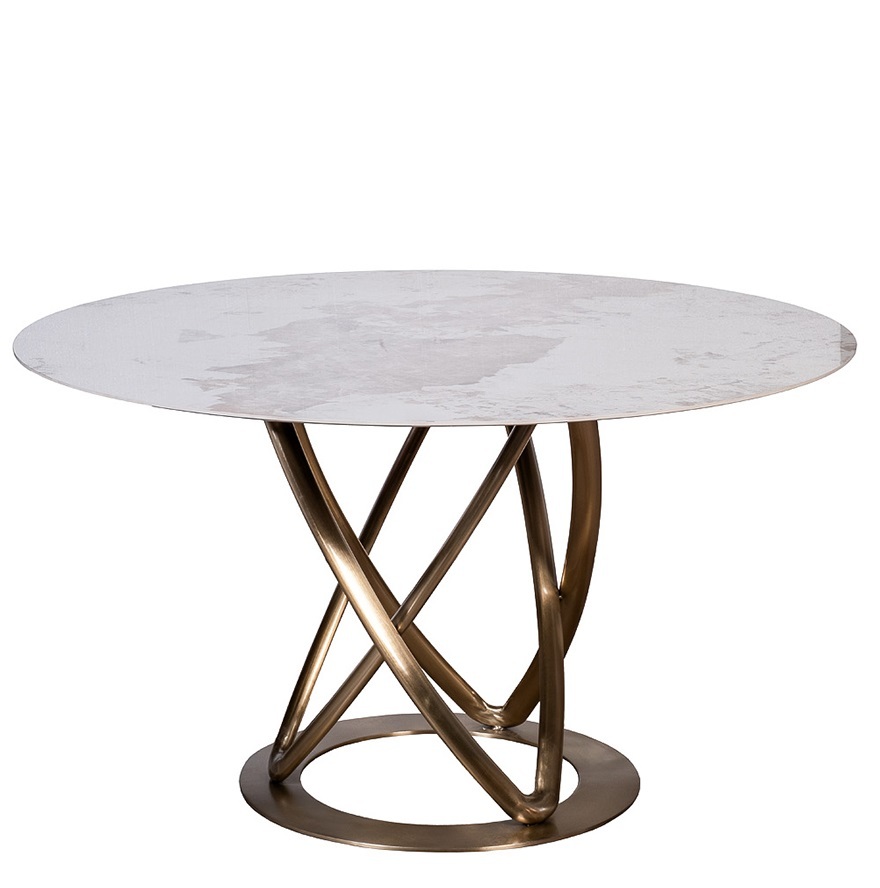 Круглый стол всегда пользуется популярностью: это самая бесконфликтная форма для общения с точки зрения психологов. Поэтому дружеские встречи, семейные ужины, переговоры будут проходить в позитивном ключе. Столешница из глянцевого керамогранита с узором натурального мрамора достаточно износостойка и не боится горячей посуды. Металлическое основание из переплетенных изогнутых труб придает этому столу воздушность и транспарентность. Толщина столешницы - 12мм.