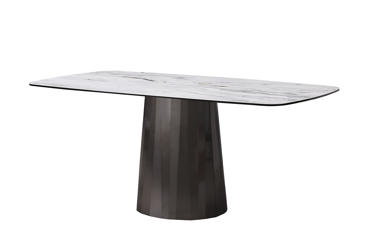 Большой обеденный стол с многогранным основанием из нержавеющей стали с износостойкой двухслойной столешницей из керамики и закаленного стекла. Спокойный цвет сероватого мрамора на столешнице позволяет акцентировать красоту изысканной посуды, столовых приборов, и в полной мере насладиться трапезой - за счет размера столешницы сервировка может вместить много разных блюд и обеспечить достаточно личного пространства каждому. Толщина столеницы 13мм (3мм керамика и 10мм стекло).