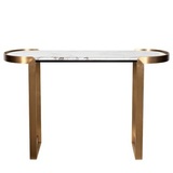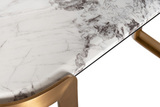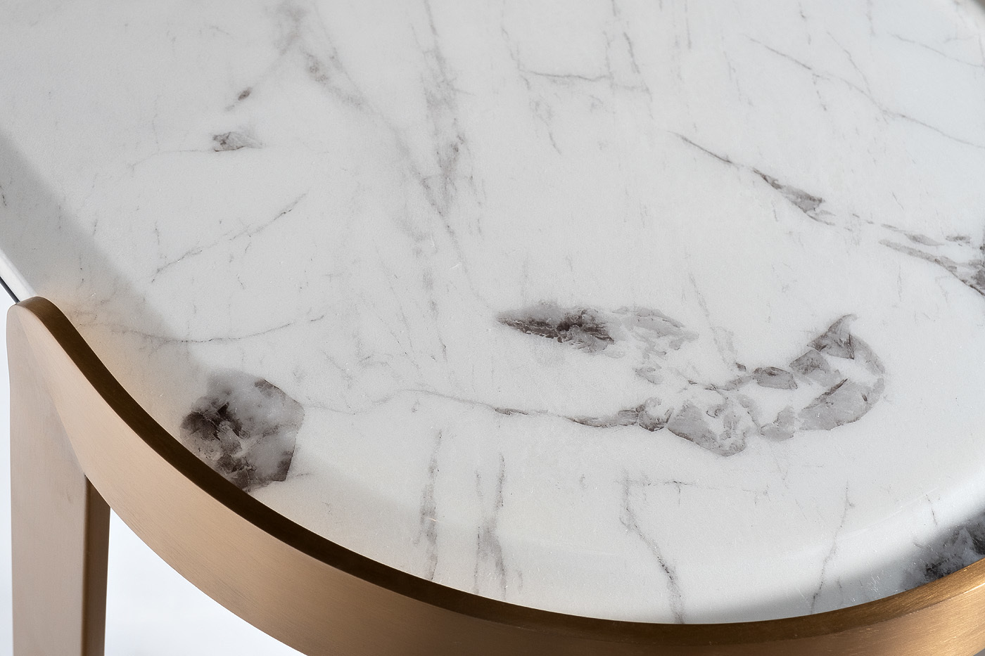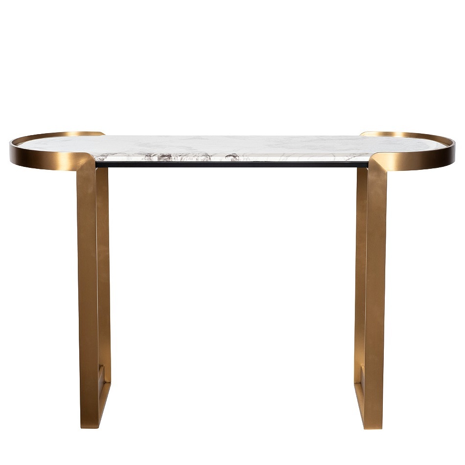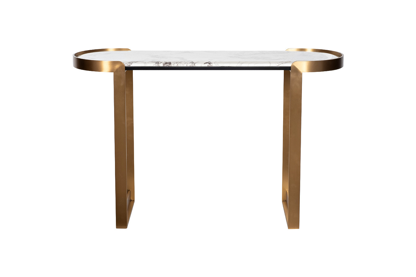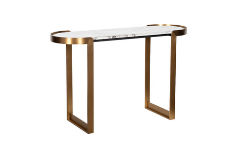 Консоль из коллекции Sevilla сочетает в себе самые последние тренды мебельного дизайна класса «люкс», отделку современными материалами с использованием стали цвета латунь, зашлифованной до сатинового блеска, и искусственного мрамора на основе МДФ с пленкой. Элегантные округлые формы, благородство мраморной фактуры, высокое качество исполнения делает предмет коллекции образцовой мебелью для современной обстановки. Консоль гармонично дополнят тумбочка, комод и стеллаж из этой же коллекции.