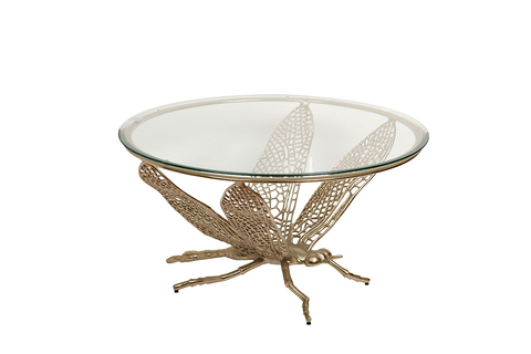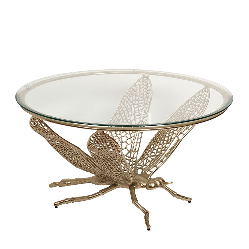Удивительный дизайнерский стол в стиле ар-деко сделает вашу спальную комнату, гостиную или холл единственными в своем роде! Изящная стрекоза из золотистого металла подпирает крыльями столешницу из прозрачного закаленного стекла. Этот стол ручной работы подойдет артистичным и утонченным натурам, станет невероятным и изысканным подарком дорогому человеку, впишется в интерьер в современном стиле, стиле ар-деко или фьюжн.