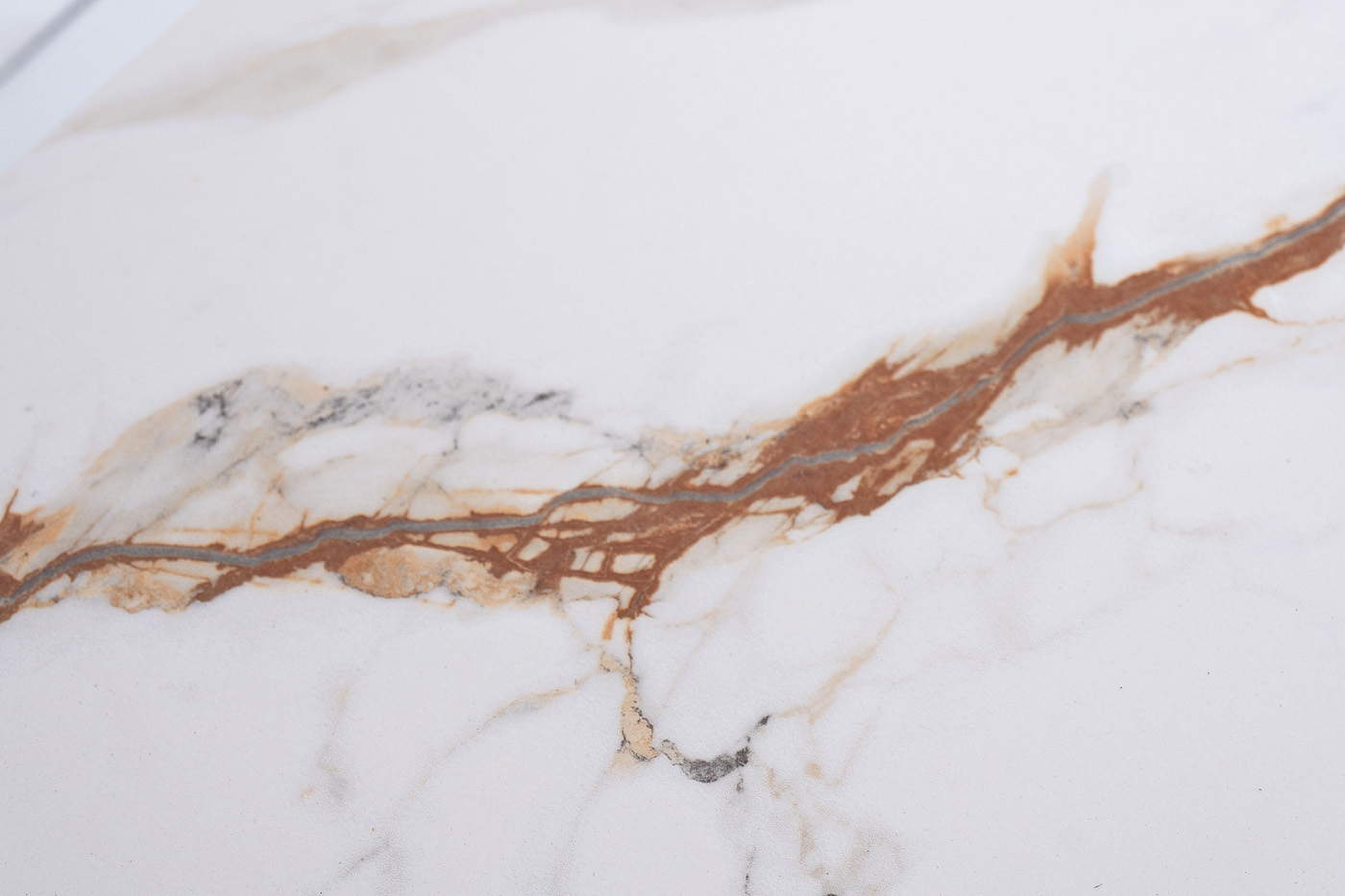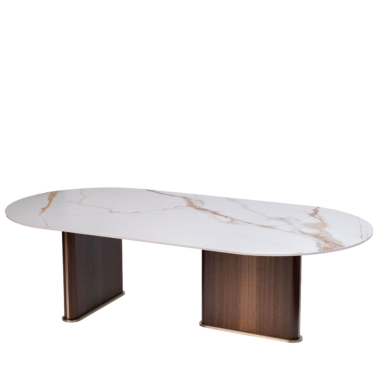 Элегантный овальный столик для гостиной или зоны отдыха, в котором сочетаются три стихии - камень, дерево и металл. Столешница изготовлена из прессованного при высокой температуре каменного конгломерата, что обеспечивает высокую степень надежности и износостойкости. Опоры из древесной плиты высокого давления (HDF) с отделкой из шпона, с акцентом на золотое основание. Сочетается с круглым столиком 76AR-501C-STOL/ZH