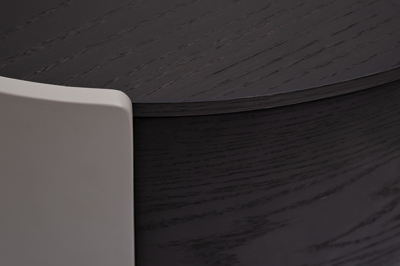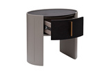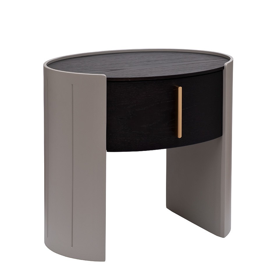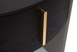 Оригинальная тумбочка в округлой форме станет стильным дополнением современного дизайна интерьера. Отделка шпоном в благородном темном оттенке отражает высокий вкус и статус хозяев дома. Выдвижной вместительный ящик украшен минималистичной вертикальной ручкой в золотом оттенке. Прочные и устойчивые ножки обтекаемой формы завершают непревзойденный дизайн мебели. Тумбочку можно установить рядом с кроватью, возле зеркала, у туалетного столика или использовать в качестве подставки для вазы с цветами.