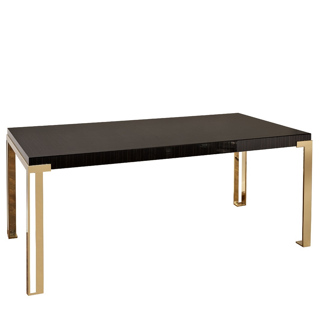 Элегантный обеденный стол в стиле ар-деко из коллекции Golden Prism покоряет изысканной геометрией форм и роскошью отделки. Тщательно подобранный шпон драгоценного эбенового дерева с золотистыми прожилками создает изысканный рисунок. Столешница покрыта в несколько слоев глянцевым лаком; с двух сторон стол обрамляют подстолье и ножки из полированной нержавеюшей стали цвета шампанского. Все углы и металлические части тщательно обработаны и слегка скруглены. Стол украсит изысканную столовую, превратит семейный обед или дружескую встречу в настоящее событие. На нашем сайте представлена полная коллекция лаковой мебели Golden Prism - журнальные и обеденные столы арт. 84HB-ET319B, арт. 84HB-D319P, арт. 84HB-CT319D, комоды арт. 84HB-CH319M2, консоли арт. 84HB-CST319X, тумбочки арт. 84HB-NS319U3, арт. 84HB-TV319F2 и витрины арт. 84HB-VI319H2, чтобы ваш интерьер выглядел по-настоящему дорого, при этом просто и элегантно.