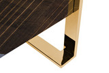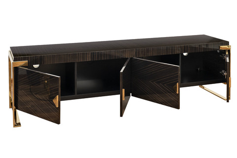 Элегантная тумба под телевизор в стиле ар-деко из коллекции Golden Prism покоряет изысканной геометрией форм и роскошью отделки. Тщательно подобранный шпон драгоценного эбенового дерева с золотистыми прожилками создает изысканный ромбовидный рисунок на фасаде. Столешница, дверцы и боковые панели покрыты в несколько слоев глянцевым лаком; с двух сторон тумбу обрамляет опора из полированной нержавеюшей стали цвета шампанского. Распашные дверцы открывают доступ к четырем вместительным отделениям. В задней панели предусмотрены воздуховоды, чтобы атмосфера внутри тумбы постоянно обновлялась. Все углы, объемные ручки и металлические части тщательно обработаны и слегка скруглены. Тумба под телевизор прекрасно впишется в изысканную гостиную, столовую или спальную комнату. На сайте представлена полная коллекция мебели Golden Prism - журнальные и обеденные столы 84HB-ET319B, 84HB-CT319D, 84HB-DT319T, 84HB-D319P, комоды 84HB-CH319M2, консоли 84HB-CST319X, тумбочки 84HB-NS319U3 и витрины 84HB-VI319H2.