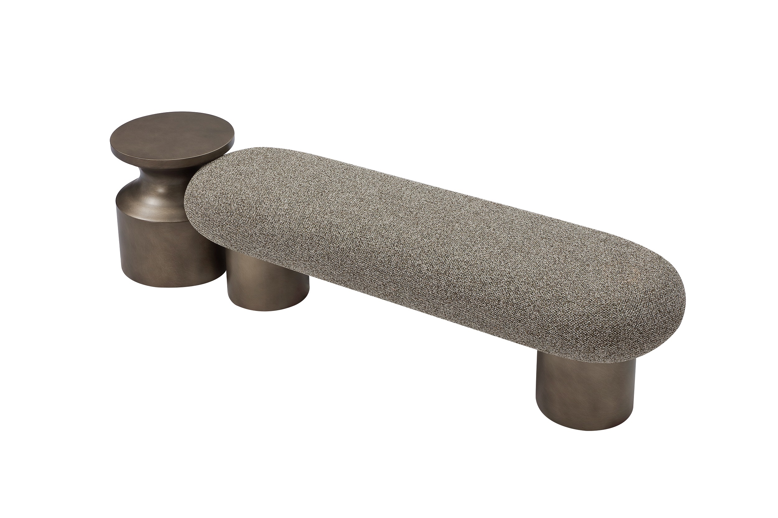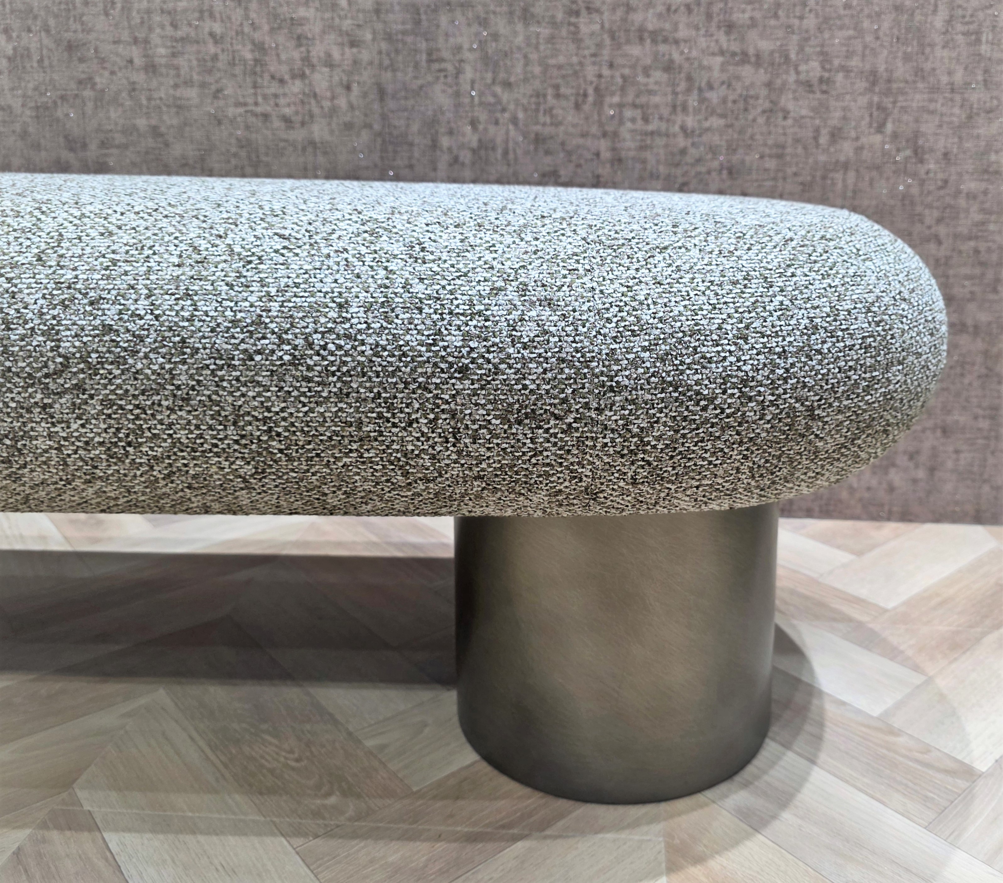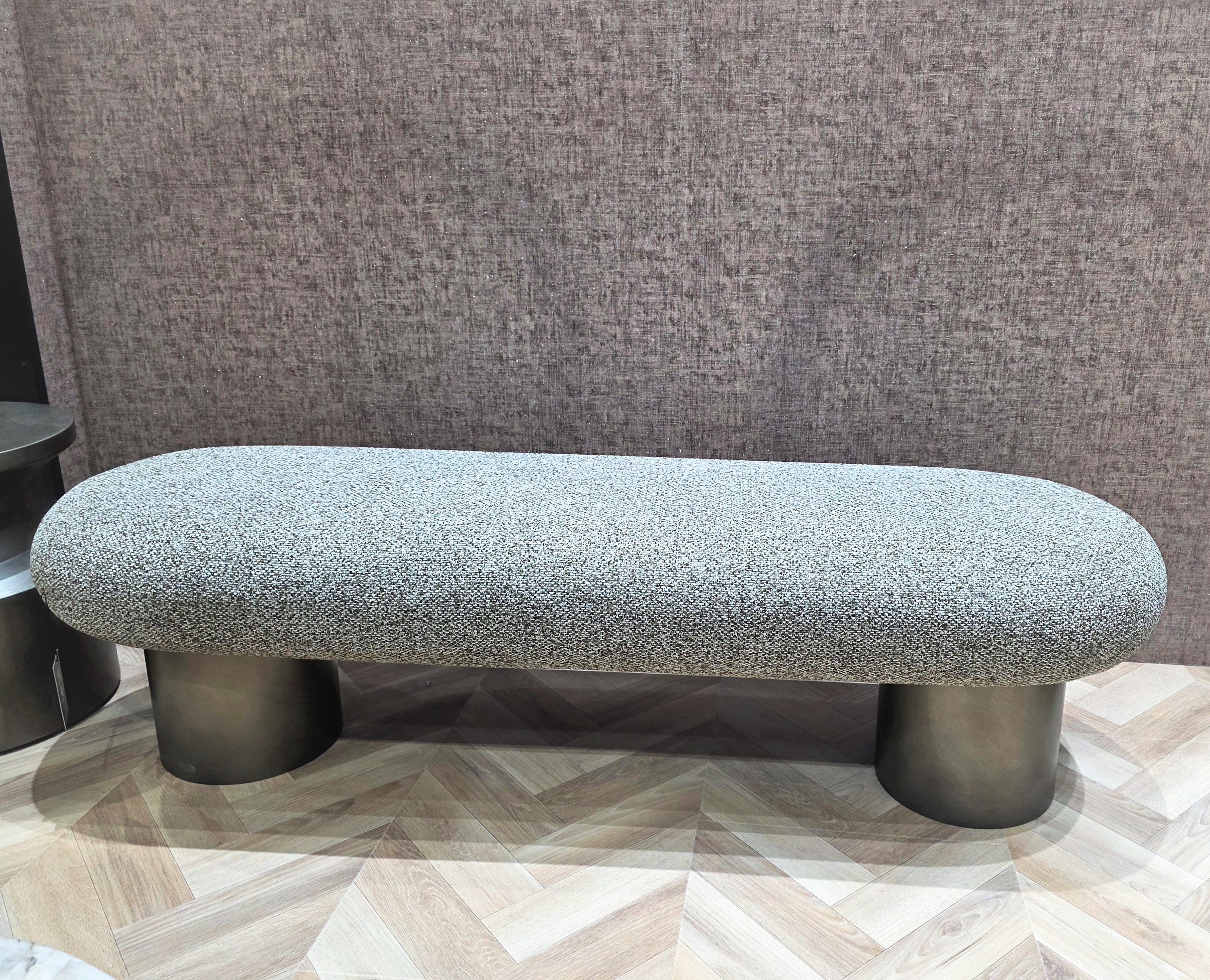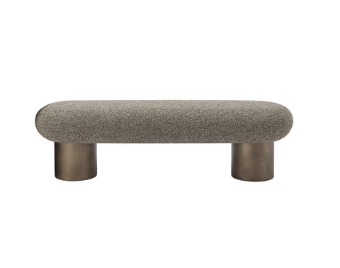 Банкетка представлена в ткани рогожка, цвет серый H300202-5. Ножки из металла, цвет — патинированная бронза TK26. Наполнитель ППУ, умеренно мягкий.