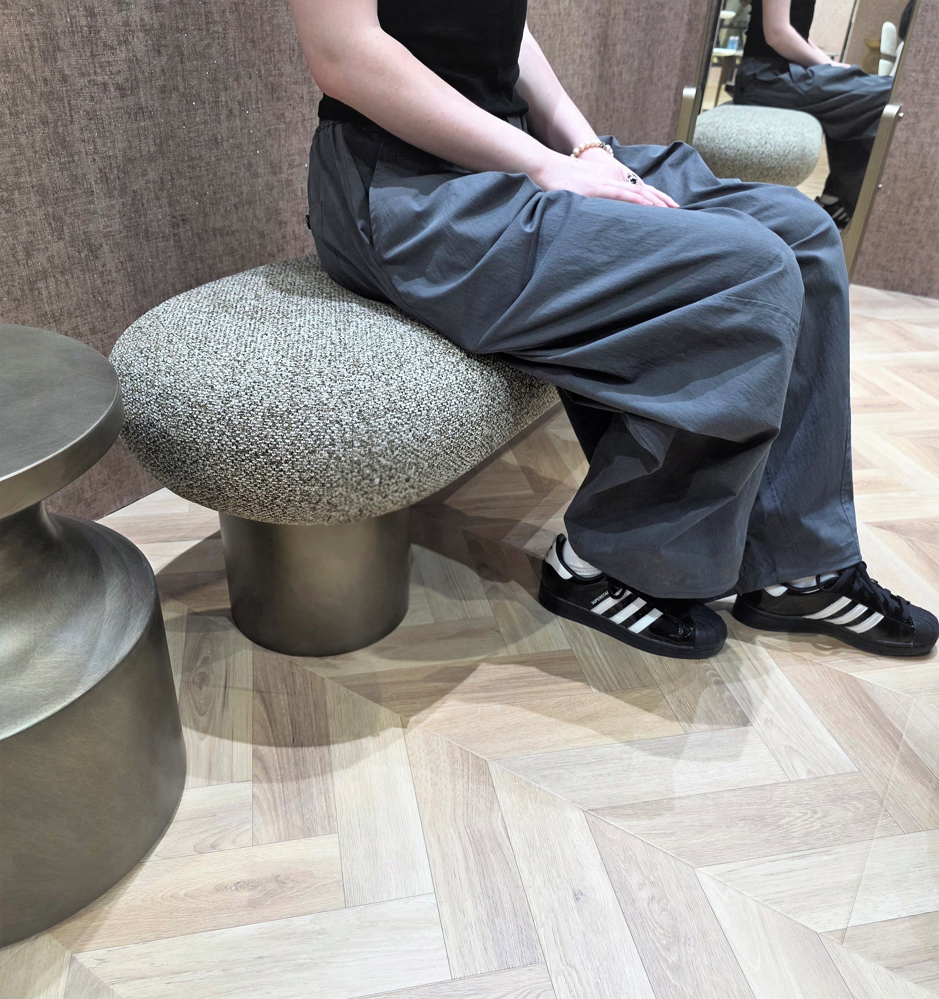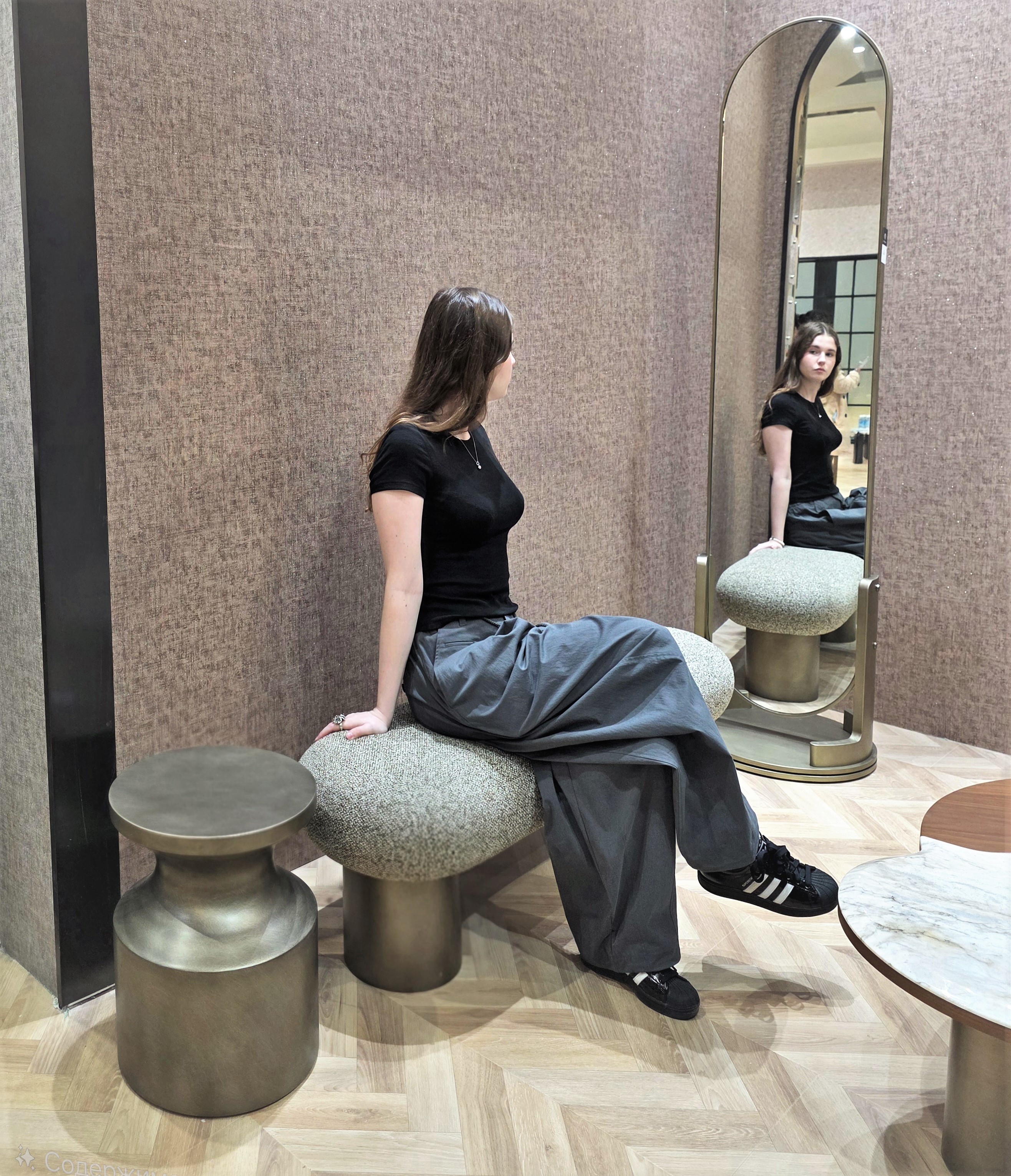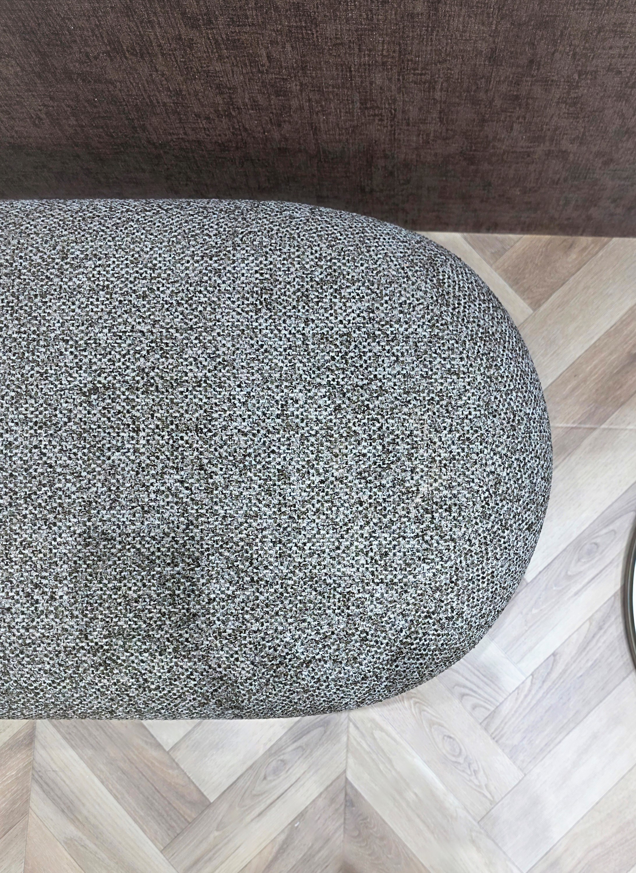 Банкетка представлена в ткани рогожка, цвет серый H300202-5. Ножки из металла, цвет — патинированная бронза TK26. Наполнитель ППУ, умеренно мягкий.