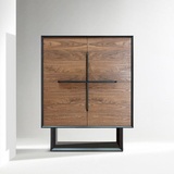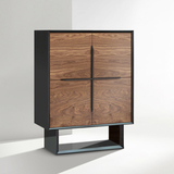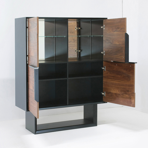 Строгая форма, сочетание гладкой эмали и древесной текстуры, графичные ручки в цвет корпуса делают изделие самодостаточным и универсальным предметом современного интерьера. Материалы: корпус - МДФ, полуглянцевая черная эмаль; фасады - МДФ, шпон американского ореха, бесцветное минеральное масло; внутреннее наполнение - ЛДСП. Фурнитура - петли с доводчиками. Внутреннее наполнение верхней части шкафа - 2 стеклянные полки Clear vision и зеркальная задняя стенка, нижней части - 2 стандартные полки. Возможен выбор других типов отделки, варианты представлены на последнем фото. Конфигурация: 4 двери / стеклянные полки / обычные полки Изделие поставляется в собранном виде.