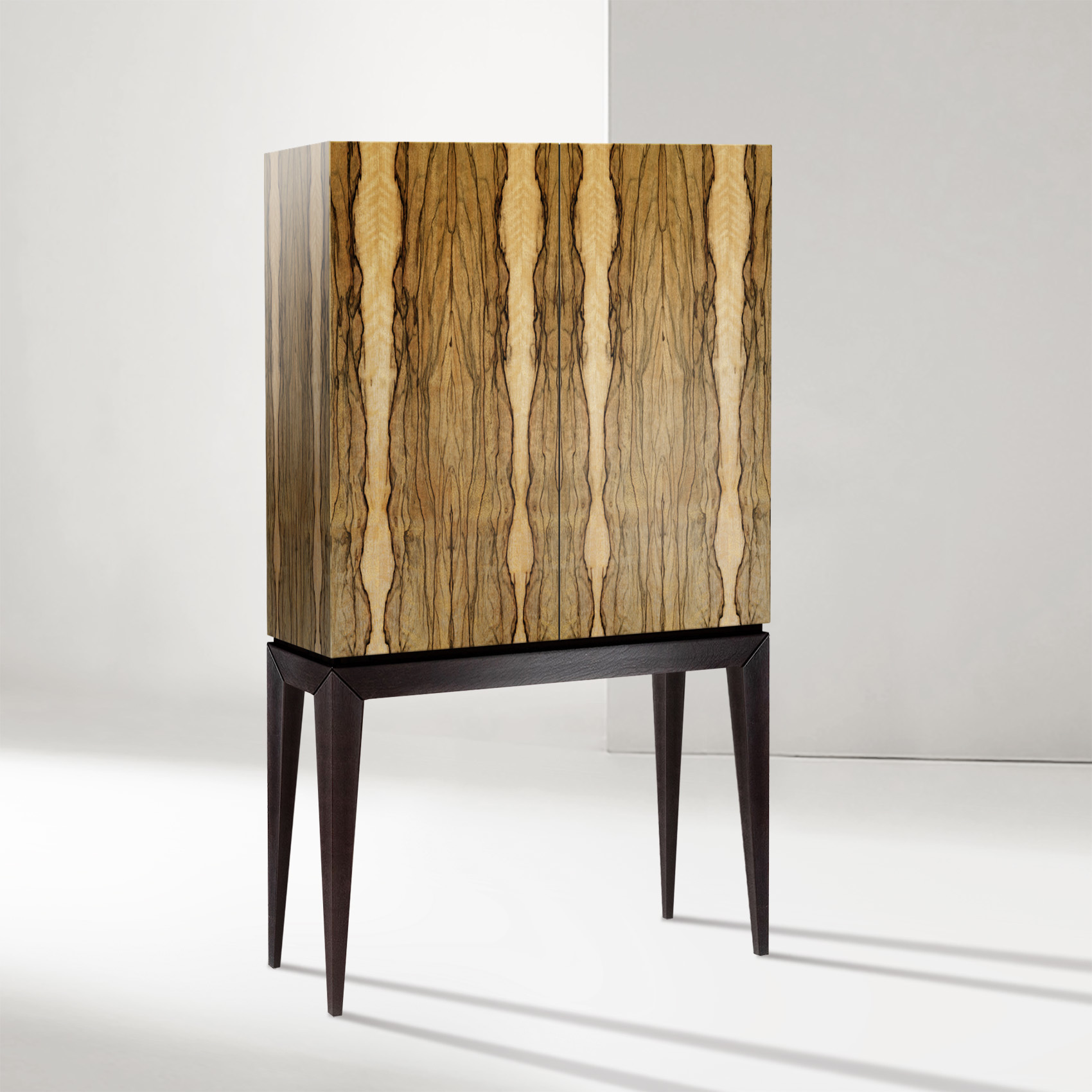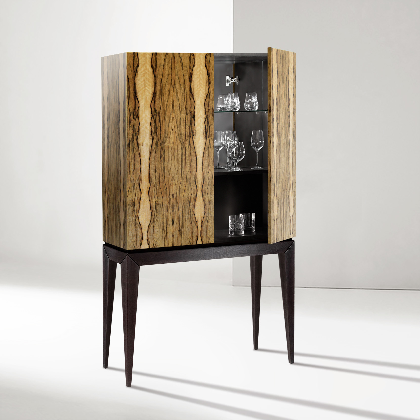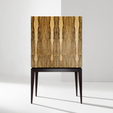 Барный шкаф в современном американском стиле с отделкой натуральным шпоном Зирикот и изящным чёрным основанием из массива ясеня. Декоративная фурнитура отсутствует и предусмотрено открытие дверец по нажатию. Зеркальная задняя стенка, стеклянные и стандартные полки организуют удобное внутреннее пространство шкафа. Материалы: МДФ, шпон зирикот, бесцветное минеральное масло; основание - массив ясеня, полуглянцевый черный лак. Фурнитура - петли с механизмом tip-on. Конфигурация: 4 двери / стеклянные полки / обычные полки Изделие поставляется в собранном виде.