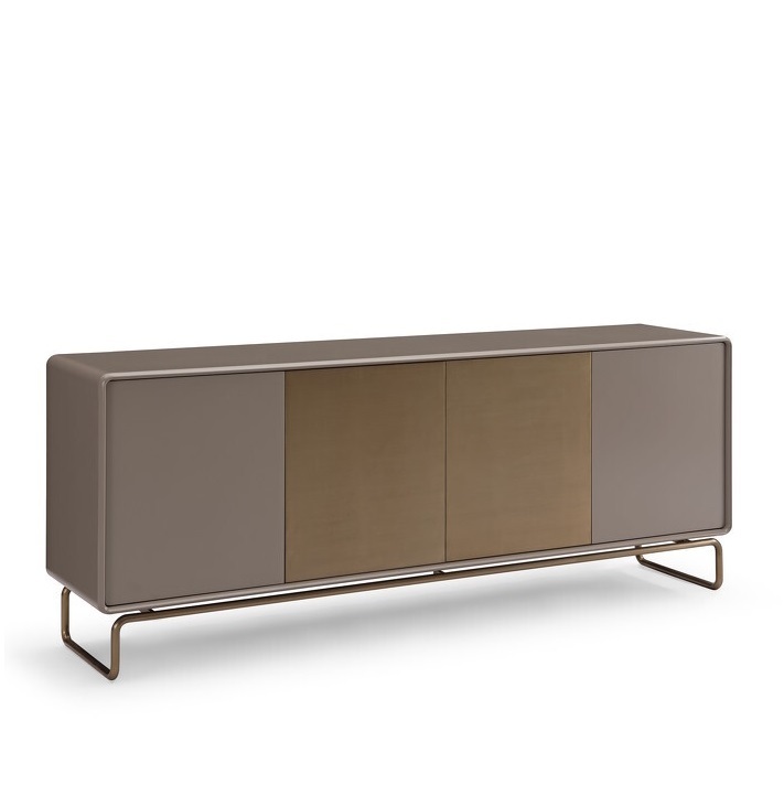 Буфет в современном стиле от итальянского бренда Fratelli Barri - стильный и функциональный предмет мебели для современной столовой или гостиной. Буфет оснащен четырьмя распашными дверцами, что позволяет организовать удобное хранение без визуального шума. Буфет выполнен из высококачественного МДФ высокой плотности. Корпус выполнен в отделке матовым серо-бежевым лаком. Ножки и фасады двух дверей в цвете бронза WJ-09.