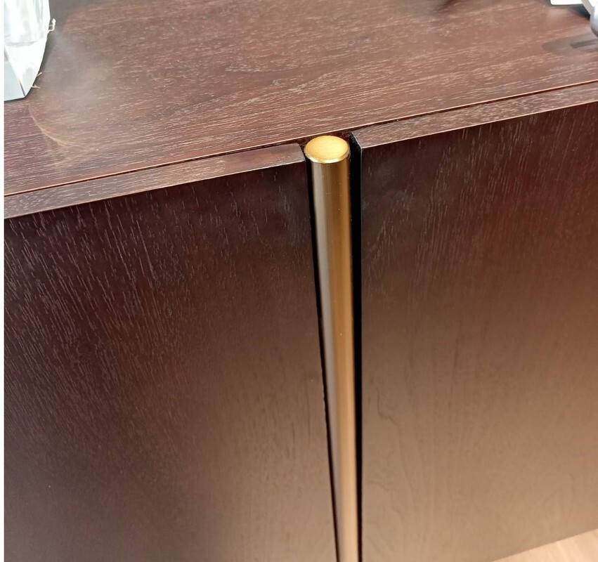 Буфет от итальянского бренда Fratelli Barri - стильный и функциональный предмет мебели для современной столовой или гостиной. Буфет оснащен четырьмя распашными дверцами, с полкой внутри, что позволяет организовать удобное хранение без визуального шума. Дверцы оснащены плавным закрытием "soft close". Буфет выполнен из высококачественного МДФ высокой плотности. Корпус выполнен в отделке из шпона ореха, декоративные детали и ножки из нержавеющей стали в цвете бронза. На ножках декоративные черные матовые колпачки, что придает буфету нотку строгости.