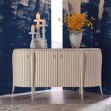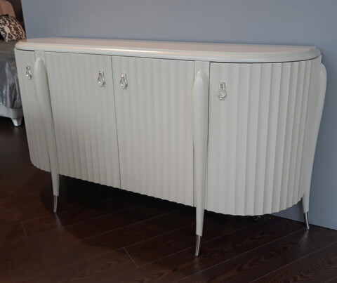 Изящный буфет Rimini от итальянского бренда Fratelli Barri. Буфет в неоклассическом стиле, с 4-мя дверками. Закругленные фасады. Изогнутые балясины. Отделка - бежевый матовый лак. На ножках металлические колпачки. Выполнен из массива дерева и высококачественного МДФ класса Е1. Цвет фурнитуры - серебро. За каждой дверкой расположена полка для хранения. Полки - белого цвета.