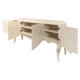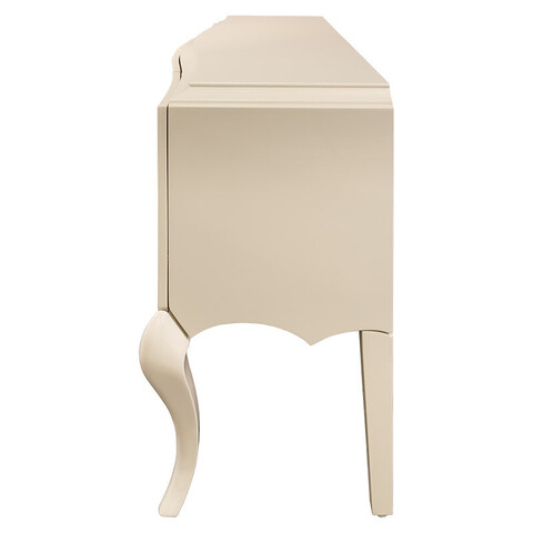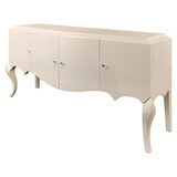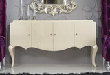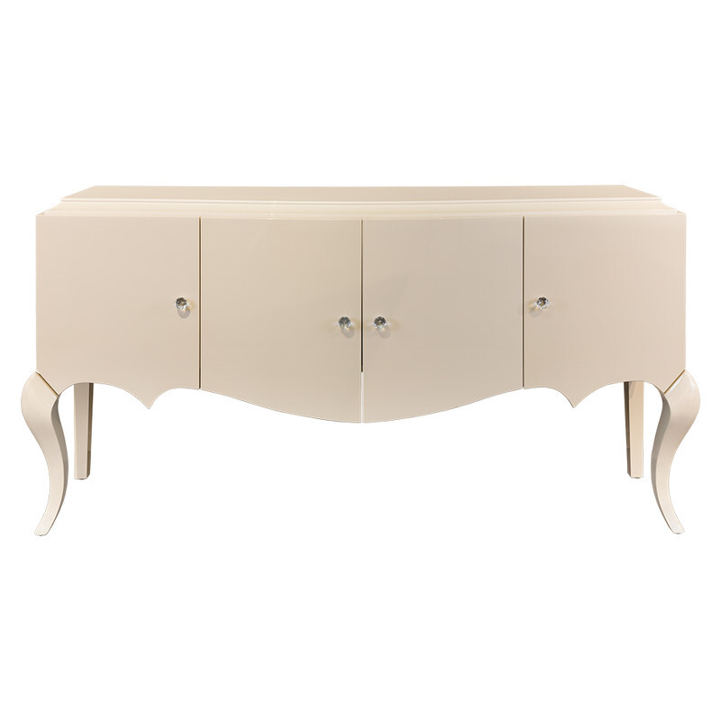 Буфет с резным фронтом на изогнутых ножках выполнен в стиле Ар деко. Отделка сверкающий жемчужный лак. Предназначен для хранения посуды. За 4 распашными дверками по 1 полке в каждой нише (по центру). Высота каждой ниши 39,2 см.