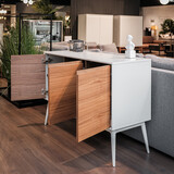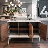 Буфет на высоких ножках из коллекции Sevilla от MOD Interiors — это образец трендового дизайна и практичности. В шпоне американского ореха сочетаются теплые тона и естественная текстура, которые усиливают визуальный магнетизм изделия. Матовый светло-серый лак придает бархатистость, смягчая линии. Корпус комода выполнен из высококачественного МДФ высокой прочности, ножки из массива дерева. Отделка корпуса и ножек - матовый лак светло-серого оттенка. Отделка фасадов ящиков - натуральный шпон ореха. Модель имеет 3 распашные дверцы с элементами системы soft-close. Уникальная система последнего поколения добавляет плавность открывания/закрывания. Эффектный, но не вычурный, этот буфет обогащает пространство архитектурными гранями и текстурным контрастом, превращая его в центральный элемент интерьера, способный задать тон остальной обстановке.