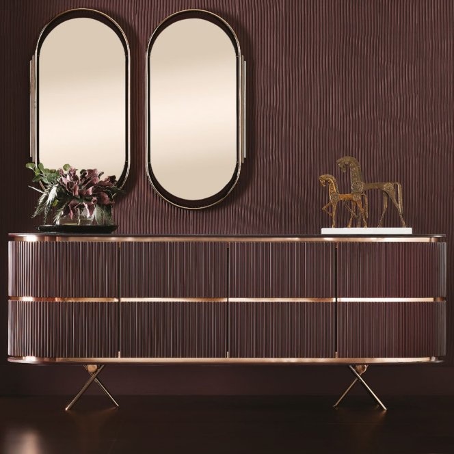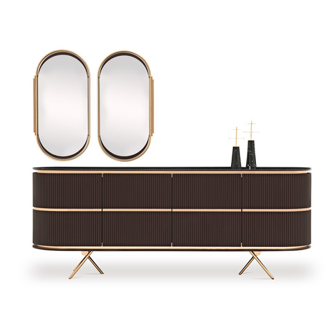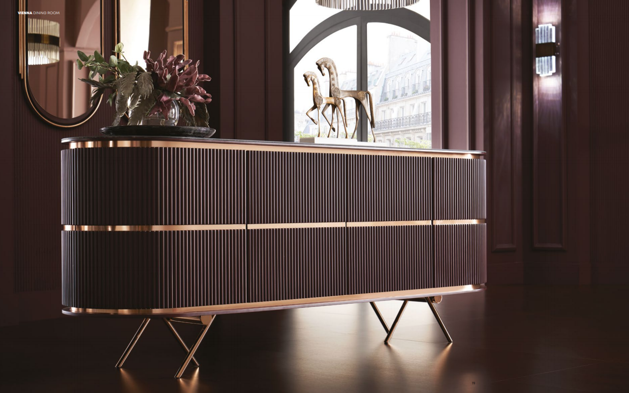 Благодаря своему романтическому и женственному стилю столовая Vienna входит в число товаров высшего сегмента; 2 различных цветовых варианта придают интерьеру элегантность, а также для этой серии характерны дизайнерский узор поверхности и ножки из розового золота.