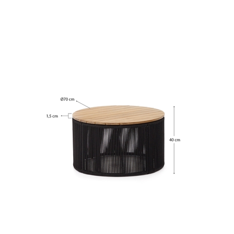 Журнальный столик Dandara от фабрики La Forma (ex Julia Grup) – эффектная отделка и натуральная древесина. Журнальный столик Dandara добавит индивидуальность вашей террасе на открытом воздухе или в гостиной с кантри дизайном. Его структура из стали и веревки придаст особый стиль любому помещению. А контраст с деревянной столешницей добавит яркость и сделает акцент на естественность вида. Стол круглой формы. Он состоит из металлической проволочной стойки с черной веревочной обмоткой и деревянной столешницы. Столешница сделана из массива акации в натуральной отделке. Сверху полиуретановое покрытие, которое защищает от негативного воздействия внешней среды. Дощатая структура обеспечивает быстрое высыхание после намокания поверхности. Толщина столешницы 1,5 см. Использованная веревка синтетическая, высокой прочности к истиранию, выгоранию цвета, разрушению от влаги. Максимальная нагрузка на стол не должна превышать 40 кг. В коллекции представлены столы в двух вариантах размера. Ширина – 60/70 см, высота – 35,5/40 см, глубина – 60/70 см. Вес изделия – 7,5/9,38 кг. Чистка только деликатным способом. Эксплуатация на улице рекомендована под навесом.