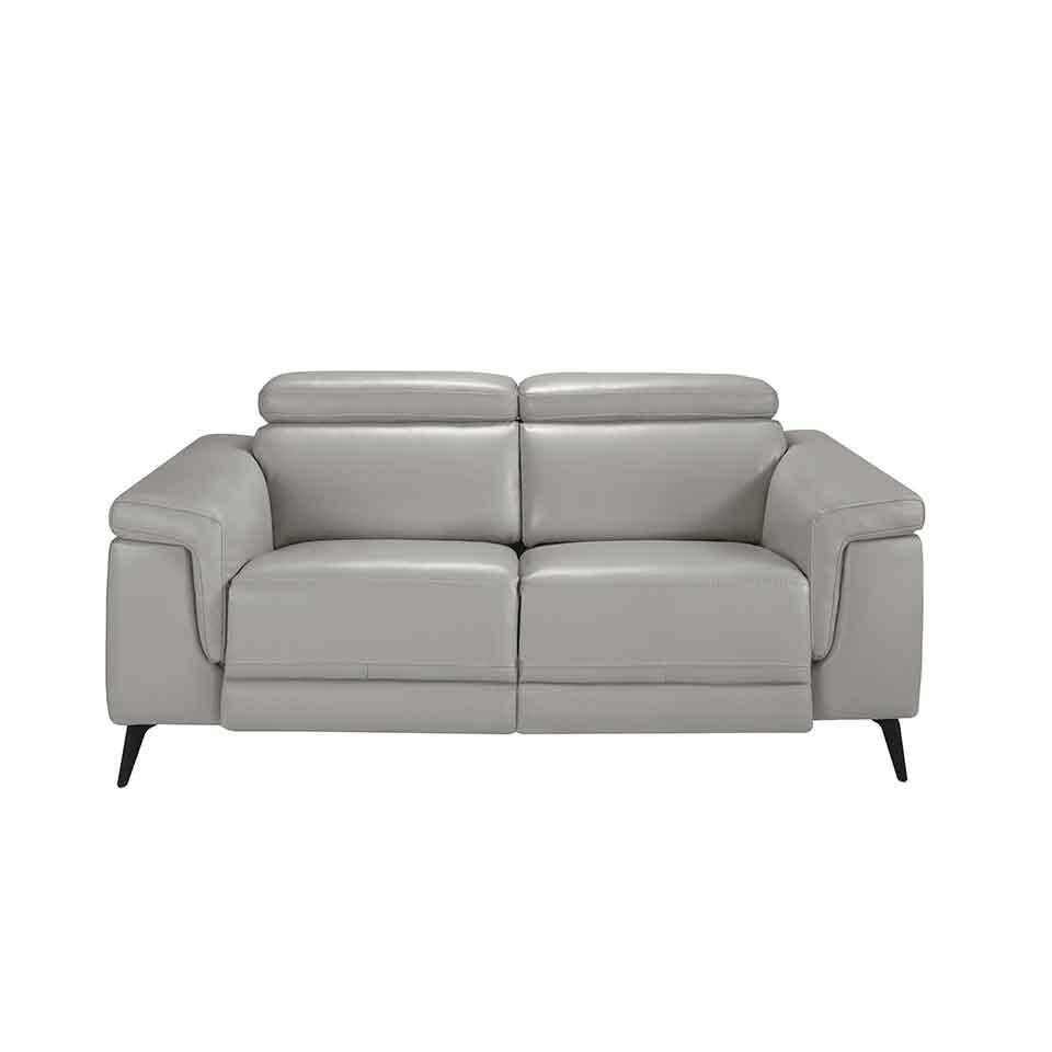 2-местный диван с обивкой из воловьей кожи серого цвета со структурой из натуральной древесины сосны, независимыми шарнирными подголовниками и двумя электрическими механизмами релаксации. Ноги из твердой стали, окрашенной черной эпоксидной смолой.
