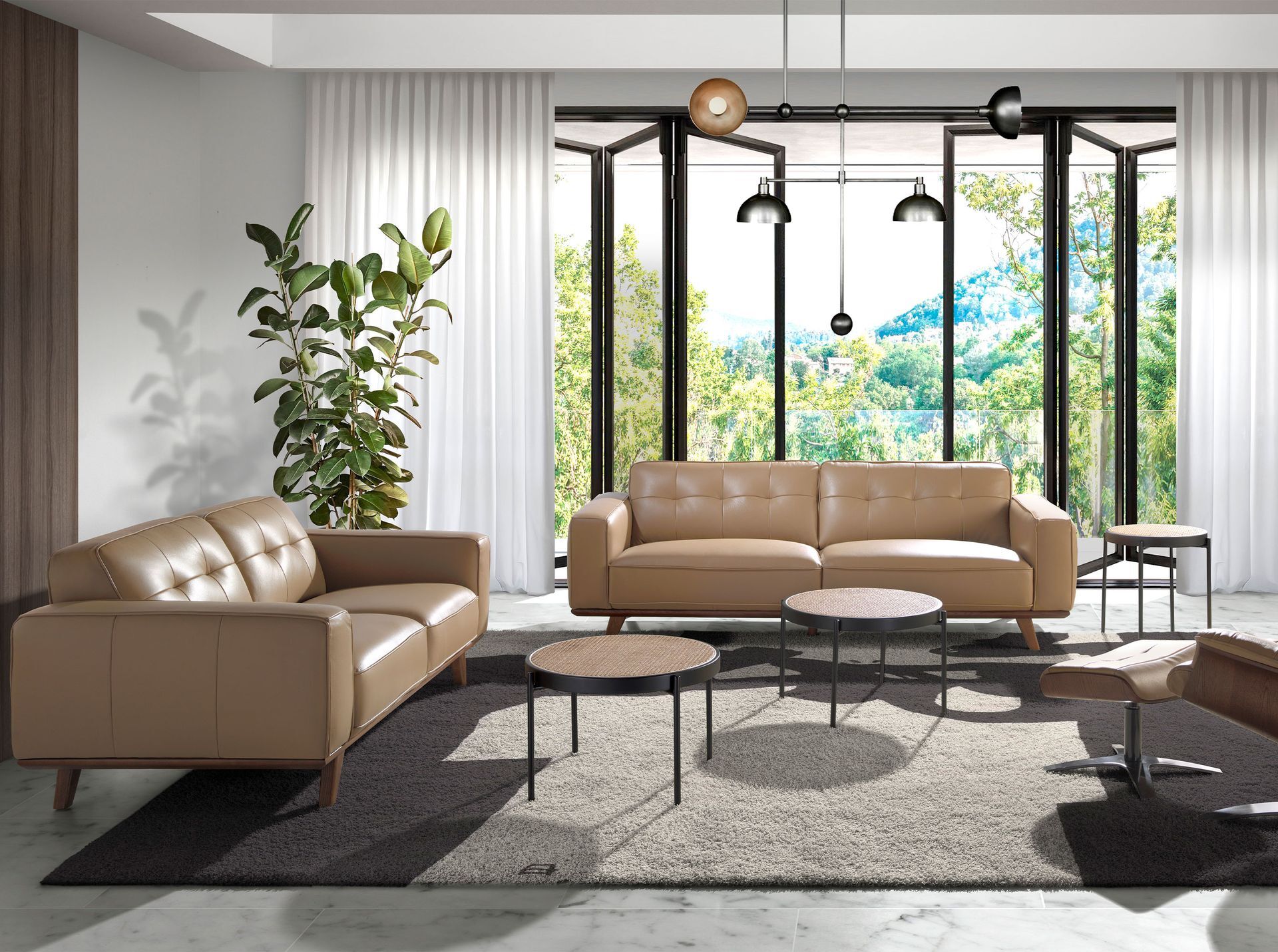 Трехместный диван с обивкой из воловьей кожи песочного цвета. Внутренняя структура из натуральной древесины сосны и структура ножек из дерева орехового цвета. Кожа - Arena M5668.