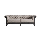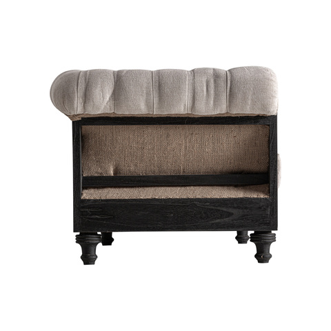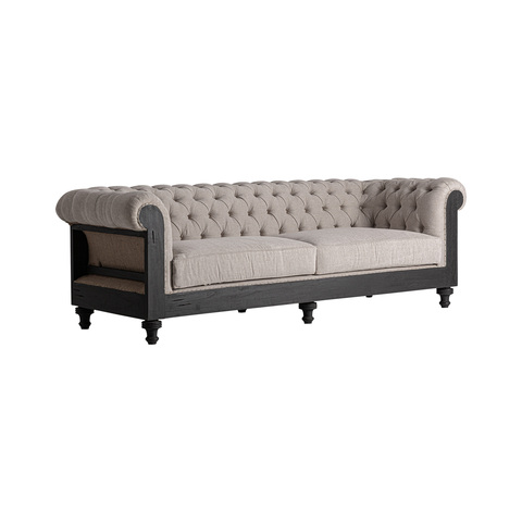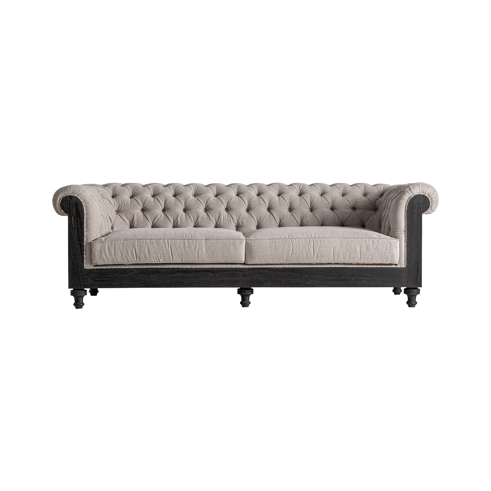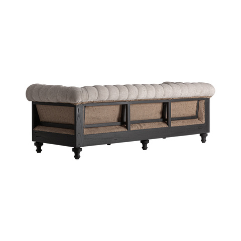Диван, изготовленный из полиэстера бежевого цвета, в сочетании с древесиной минди черного цвета и пенополиуретаном. Ширина: 240 см, Глубина: 90 см, Высота: 80 см