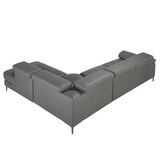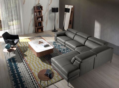 Угловой диван (R), обитый коровьей кожей серого цвета, с черными стальными ножками, окрашенными эпоксидной смолой, и независимыми регулируемыми подголовниками. Боковое сиденье с электрическим механизмом релаксации.