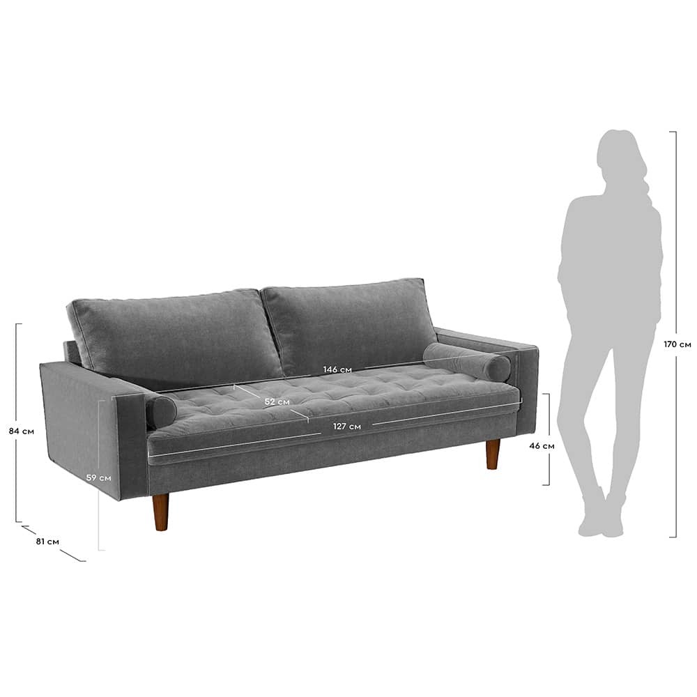 Спецификация: Материал дивана: дерево, МДФ, фанера, пружины "змейка", пенополиуретан, велюр. Ножки 19см выполнены из массива дерева натурального цвета. Размер: 146х81х84см Вес: 32,6кг Максимальная нагрузка: 300кг