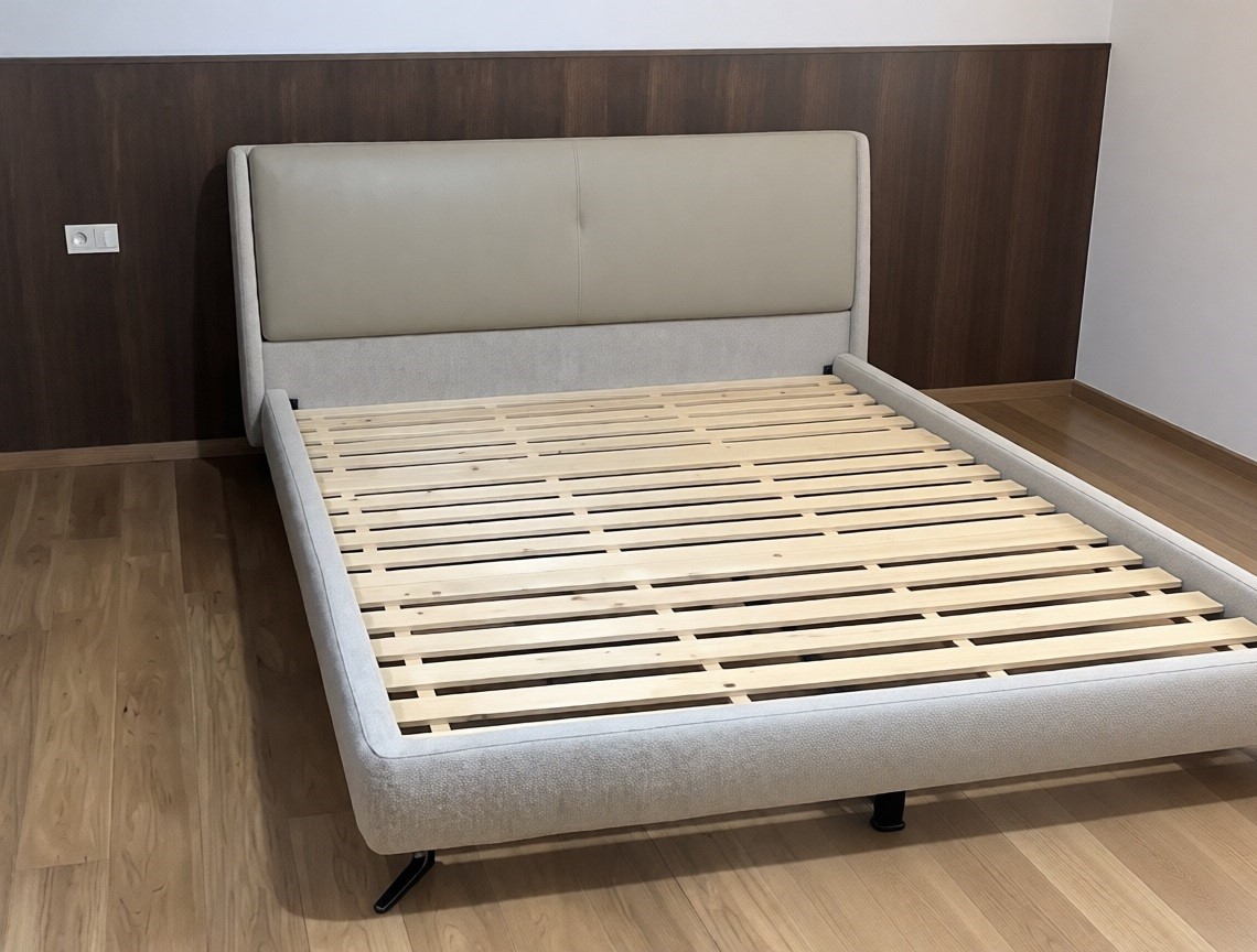 Каркас кровати выполнен из массива ясеня и металла.