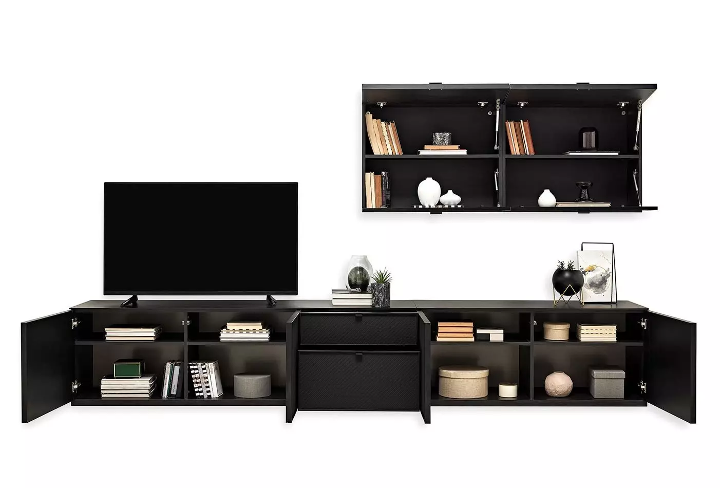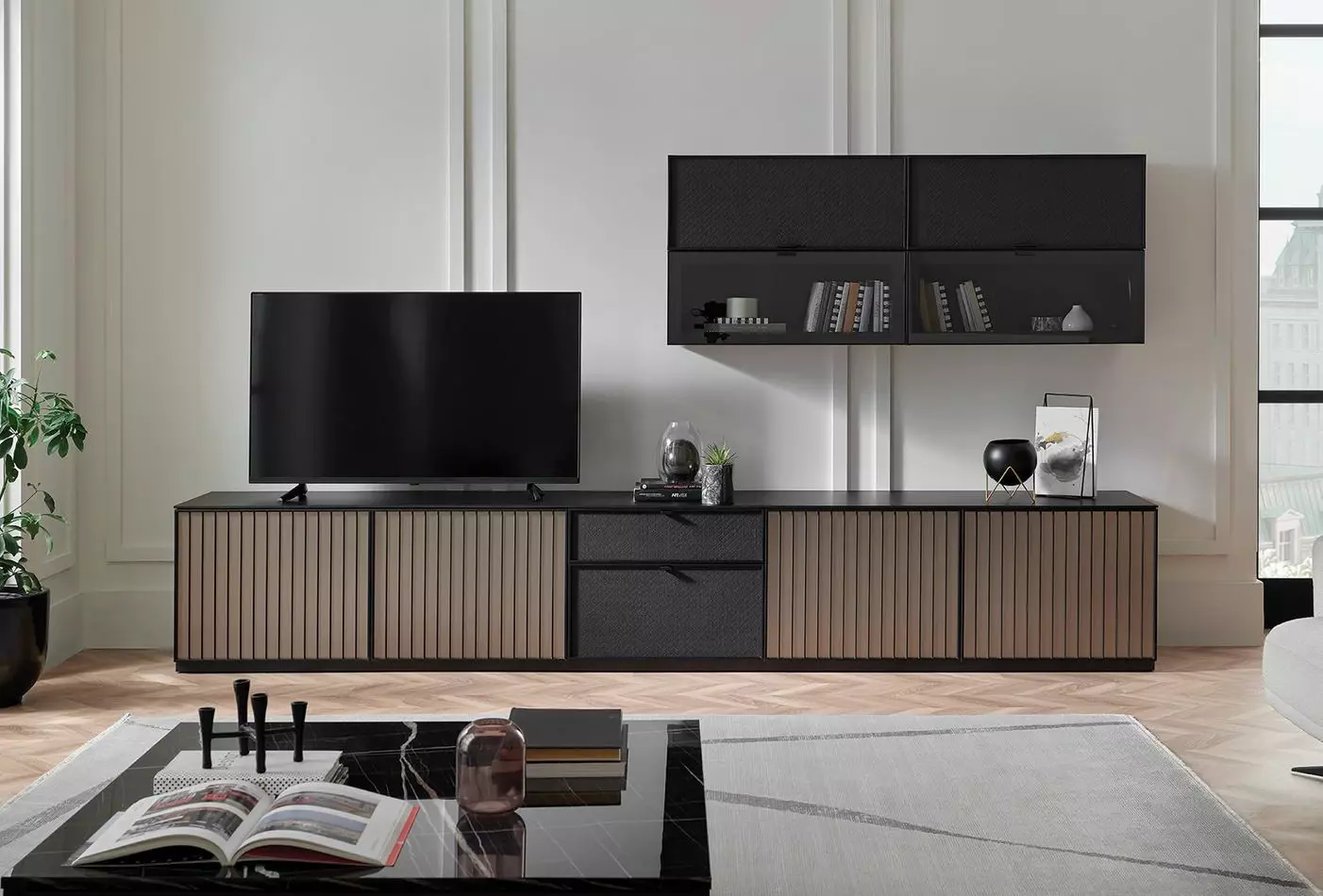 Внутренние полки выполнены из с рисунком шеврон. Дверцы шкафа оснащены подъемным механизмом.