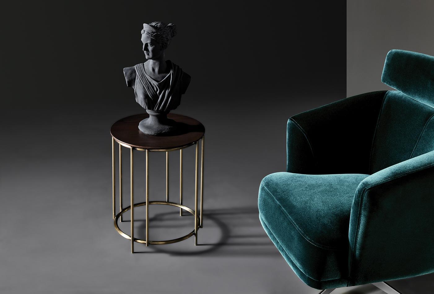 Столик выполнен из шпонированного МДФ орехового цвета и дополнен металлическими ножками, выполненными эксклюзивно для данной коллекции.