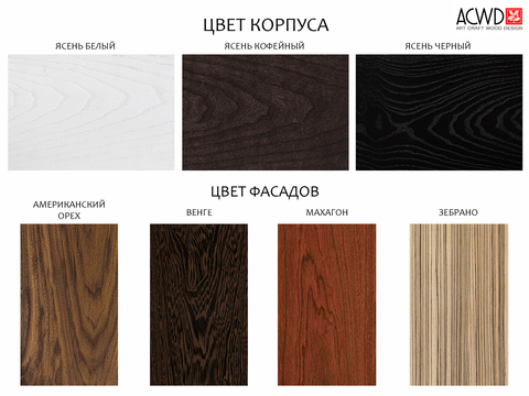 Контраст полуглянца корпуса и естественно-матовой древесной текстуры фасадов делает изделие ярким акцентом интерьера. Материалы: корпус - МДФ, шпон ясеня, полуглянцевый черный лак; ящики - массив ясеня, бесцветное минеральное масло; фасады - МДФ, шпон американского ореха, полуматовый лак; декоративная фурнитура - латунь. Фурнитура - направляющие скрытого типа с доводчиками. Возможен выбор других типов отделки, варианты представлены на последнем фото. Конфигурация: 8 ящиков Изделие поставляется в собранном виде.