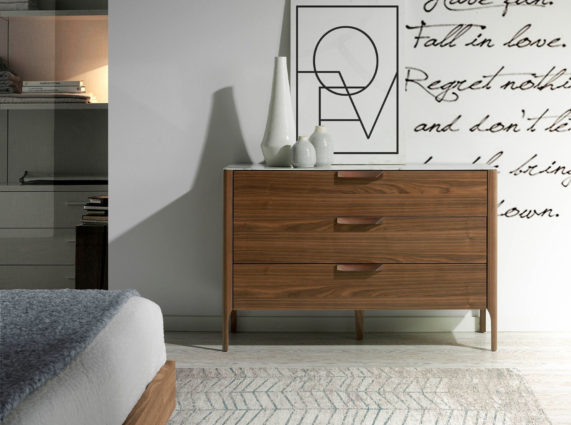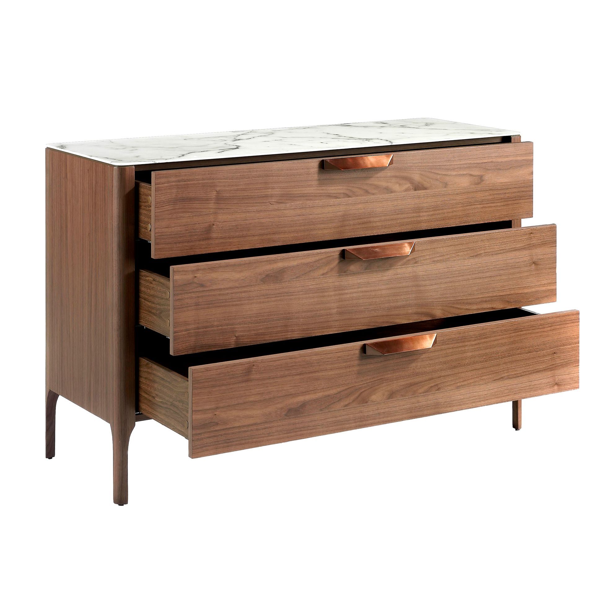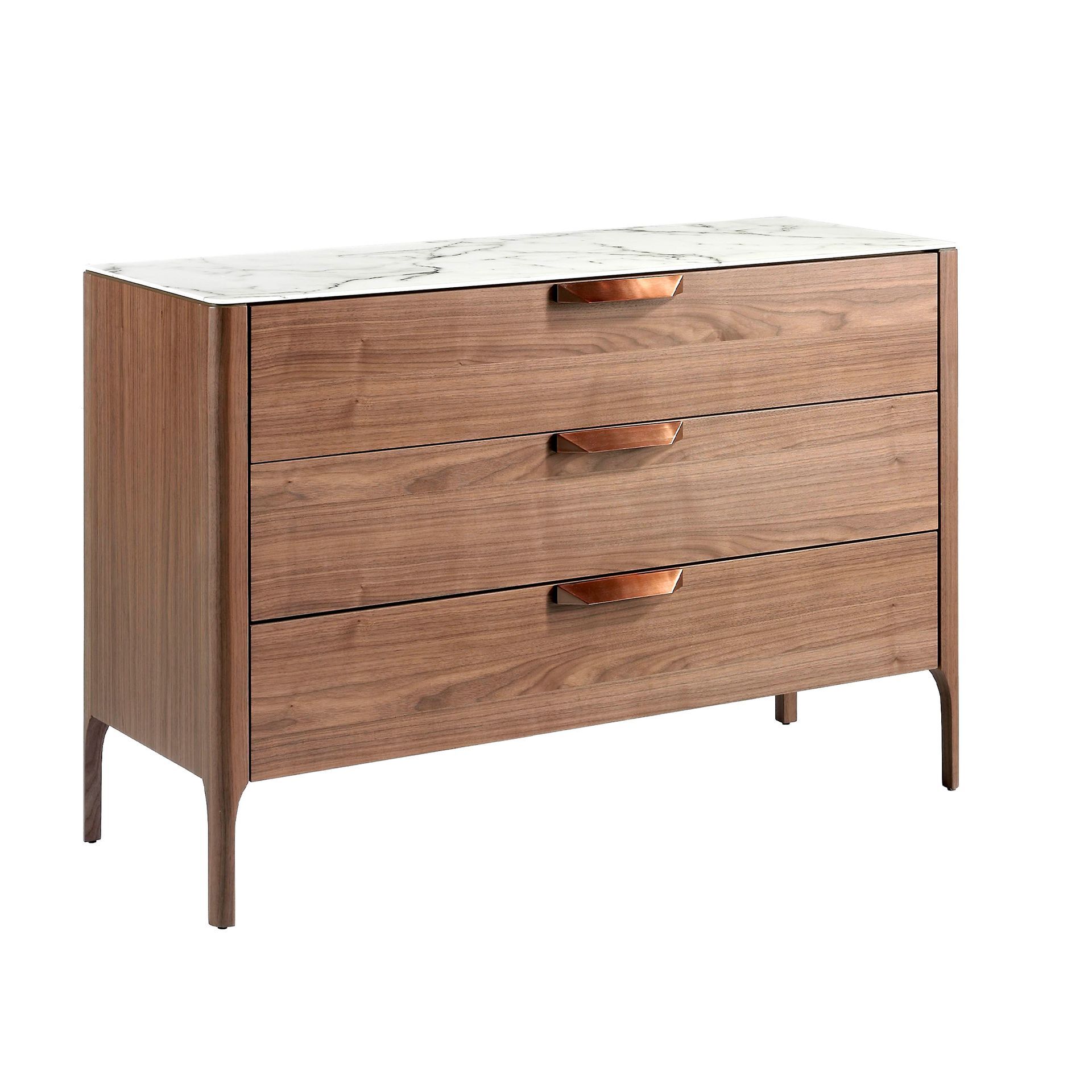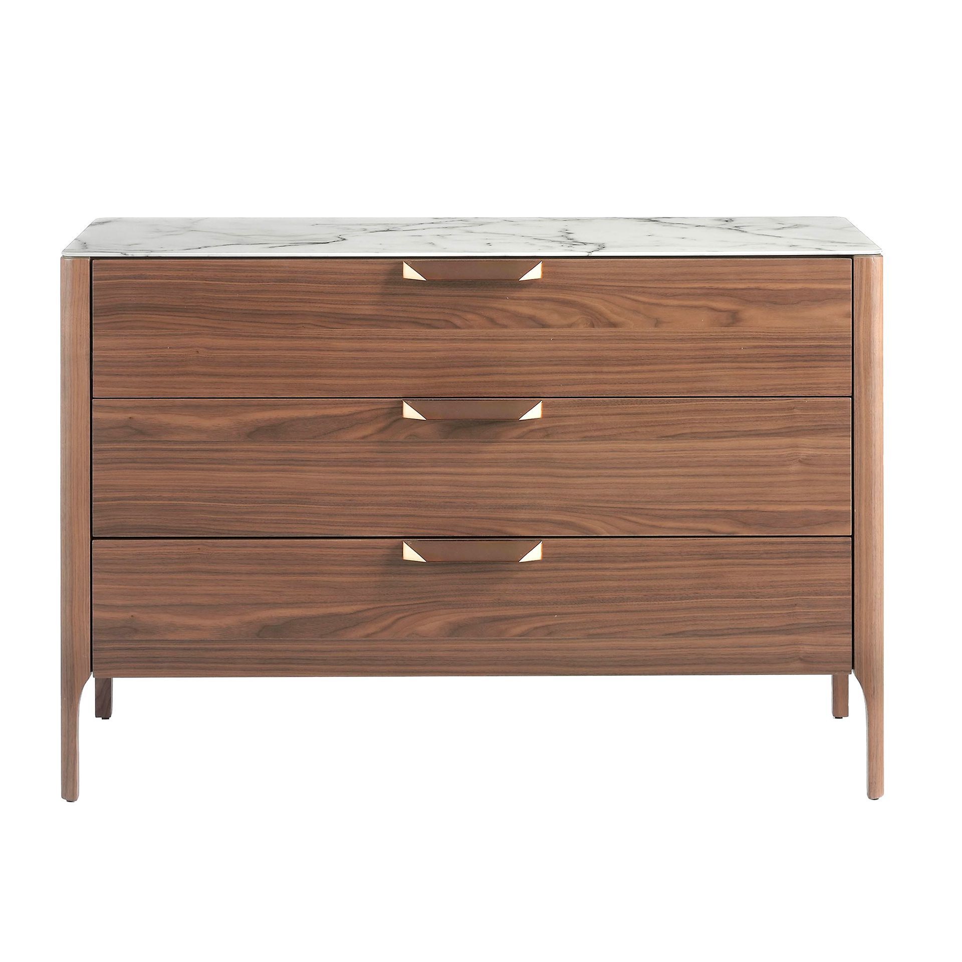 Комод CP1806-C от фабрики Angel Cerda – необычное сочетание мрамора и дерева для небанальных городских интерьеров. Комод CP1806-C моментально приковывает взгляд. Здесь дизайнерам удалось в одном изделии сразу раскрыть красоту дерева и мрамора. Столешница с каменным орнаментом смотрится эффектно, а дерево придает изделию тепла и уюта. Потрясающее сочетание. Смелый и удачный союз двух материалов, который безусловно украсит современную гостиную. Комод прямоугольной формы. В каркас встроено три продольных выдвижных ящика, оснащенных мягкой системой закрытия и деревянными ручками. Все ящики между собой одинаковы по высоте. Материал их изготовления – МДФ и шпон. Цвет для базовой фабричной модели – ореховое дерево. Столешница сделана из ударопрочной керамики цветом белого мрамора. Этот материал долговечен, легко очищается от загрязнений. Опоры сделаны из орехового дерева. Они поддерживают изделие с каждого угла и дополнительно в центре основания, для стойкости к высоким весовым нагрузкам. Масса комода составляет 70 кг. Размеры изделия: длина — 120 см, высота — 80 см, глубина — 45 см. Потребуется сборка. Крепеж, инструкция включены в комплектацию. В коллекцию CP1806 также входят прикроватная тумбочка, письменный стол, тумба под ТВ.