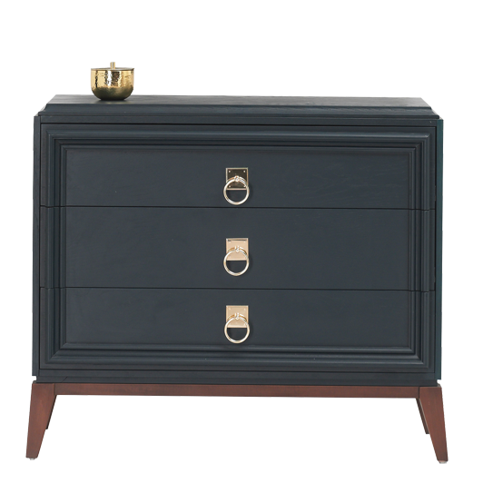 Фасады комода выполнены из МДФ 18 мм с покрытием из дубового шпона цвета Прусская лазурь и дополнены металлическими ручками, выполненными эксклюзивно для данной коллекции. В ящиках и полках используются материалы толщиной 8 мм с рисунком под твид, подчеркивающим эксклюзивность мебели фабрики. Дверцы оснащены доводчиками. Ножки – массив.