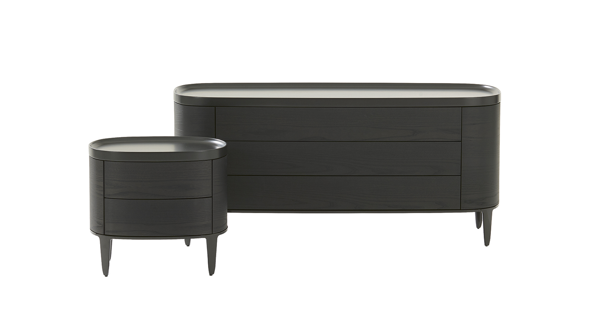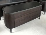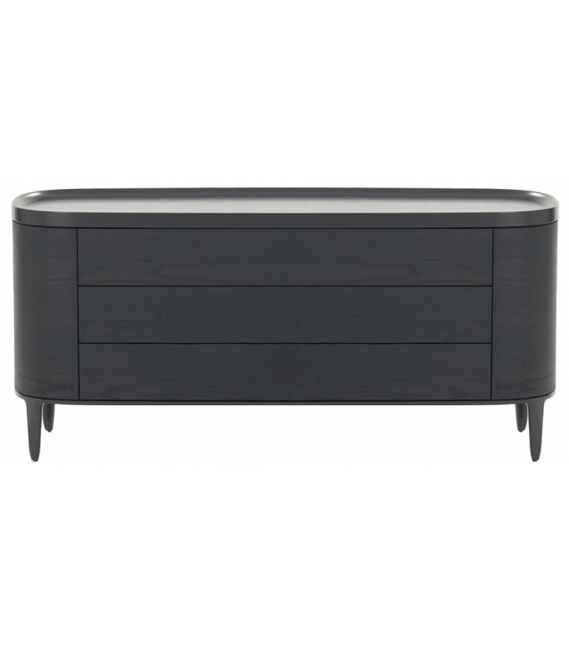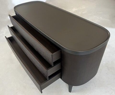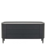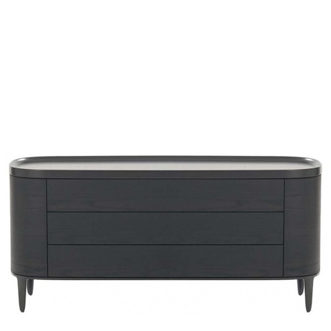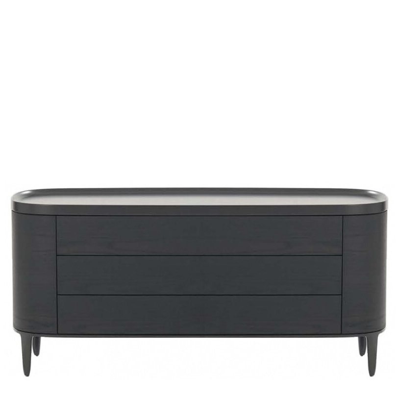 Комод выполнен из МДФ + шпон в цвете черный вяз. Столешница покрыта матовым лаком. Слегка изогнутый край предотвращает падение предметов. Матовые металлические ножки. 3 выдвижных ящика открываются легким нажатием. Выдвижная система со скрытым креплением.