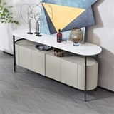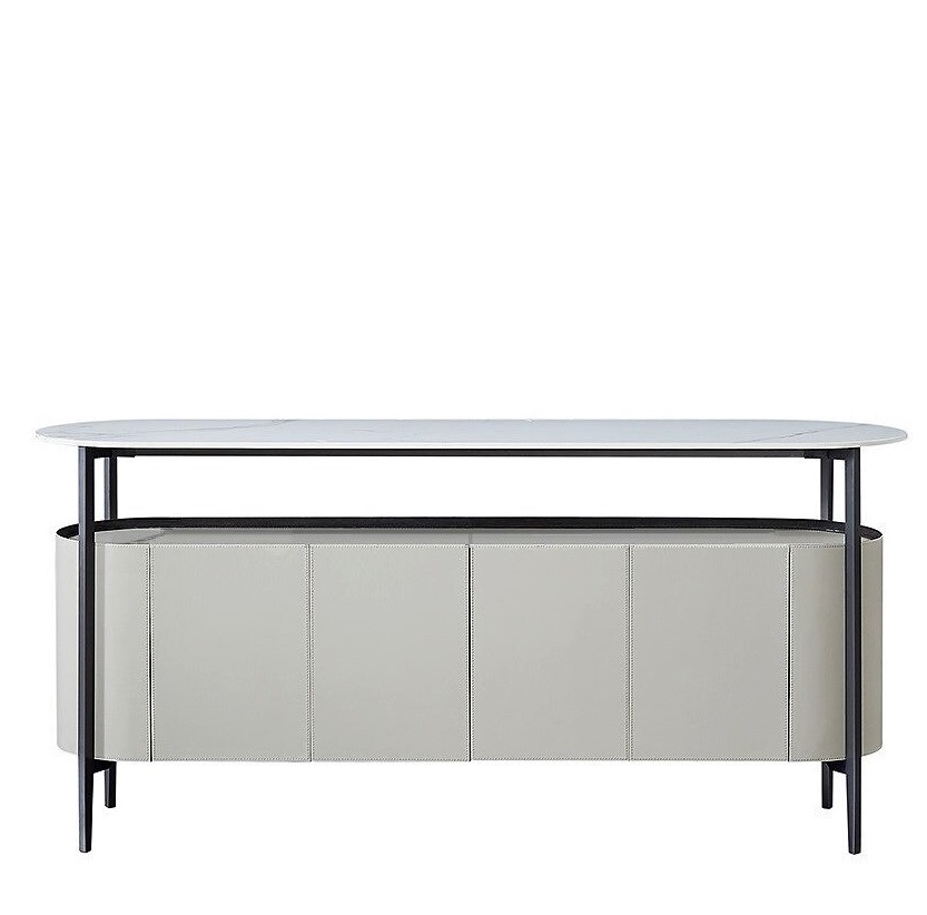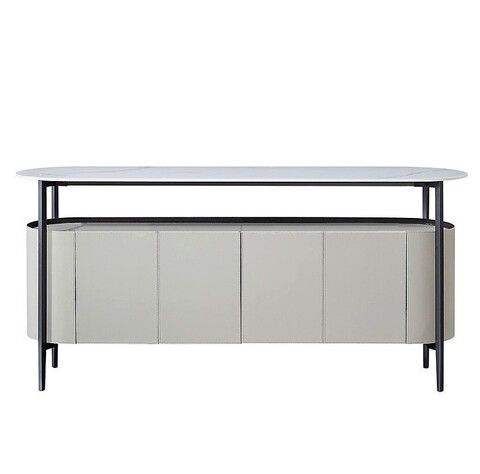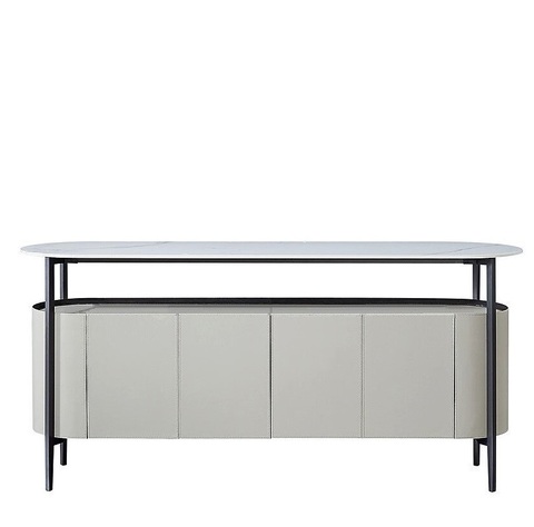 Комод с распашными дверцами выполнен в отделке из экокожи серого цвета.