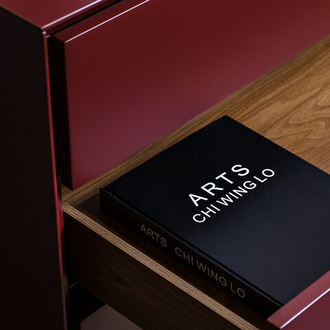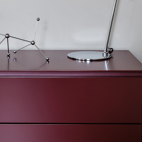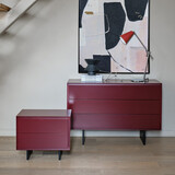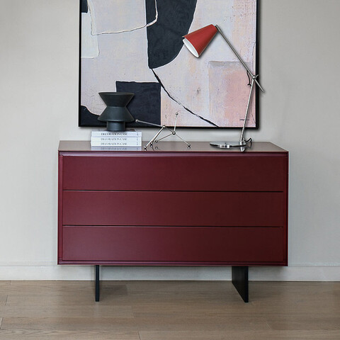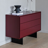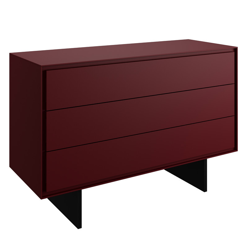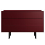 Акцентный компактный комод Miramar в современном стиле на высоких ножках. Комод выполнен из высококачественного, сертифицированного МДФ высокой плотности, ноги из металла окрашены в черный матовый лак. Отделка - роскошного матовый лак винного оттенка. У комода три выдвижных ящика со скрытыми направляющими и механизмом открывания push to open (открывание нажатием).