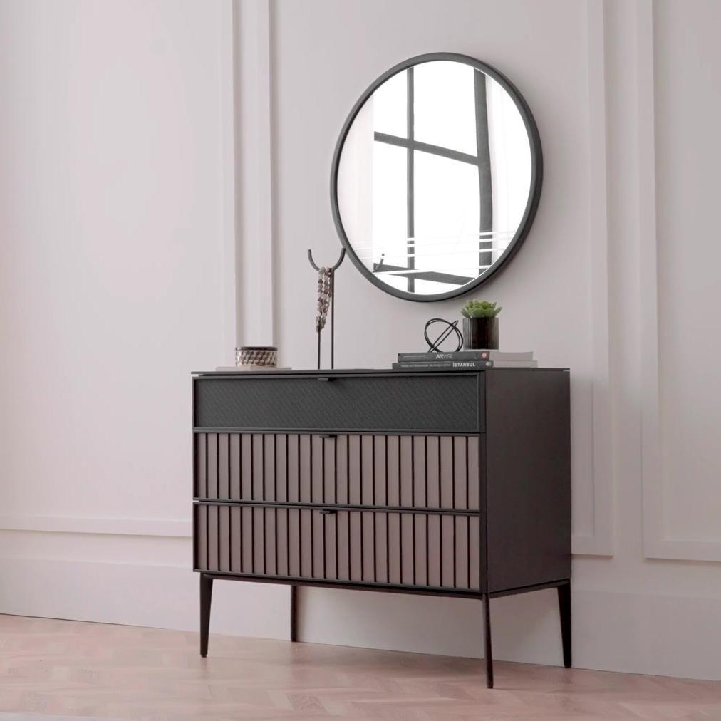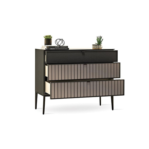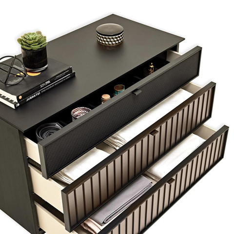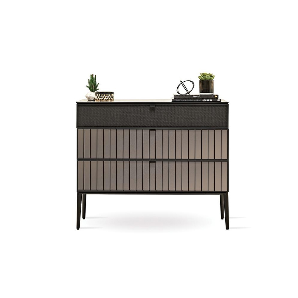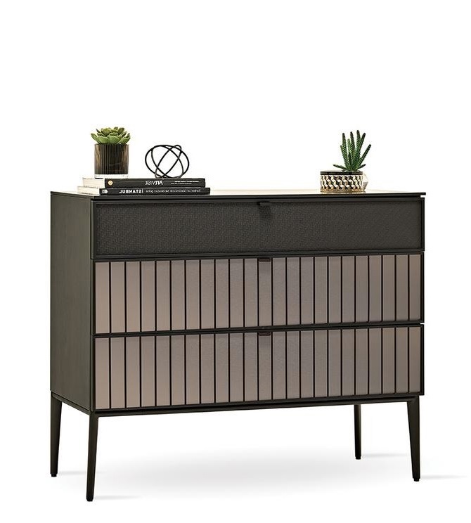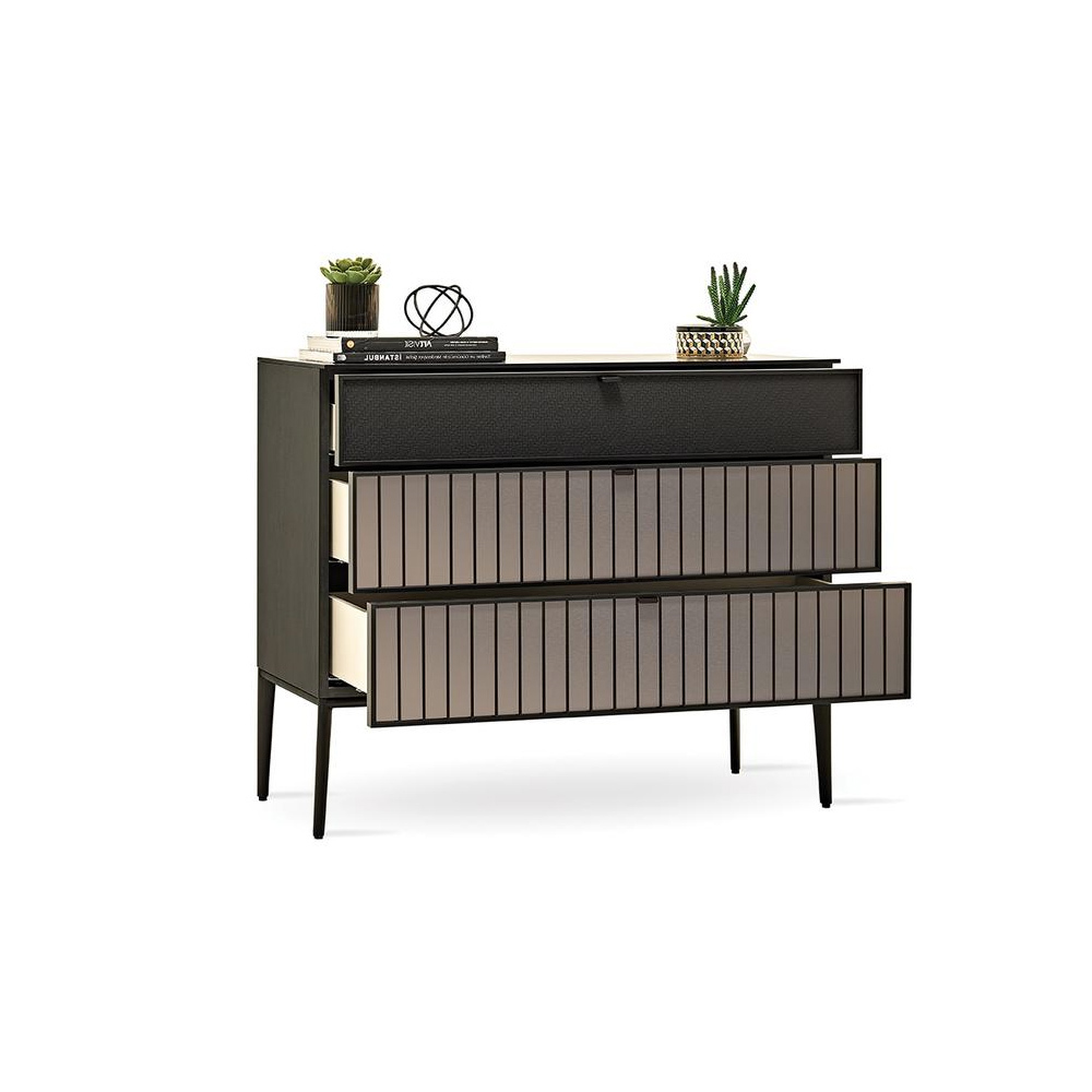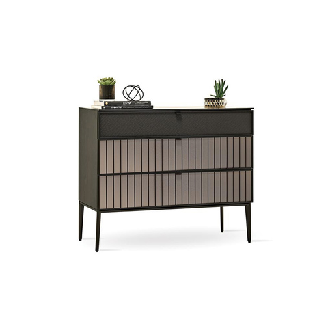 Благодаря сочетанию черной профильной рамы, эффекта металла на корпусе, черных матовых металлических ручек, и кожаным вставкам на поверхности фасада комод подчеркивает элегантность и утонченность интерьера.