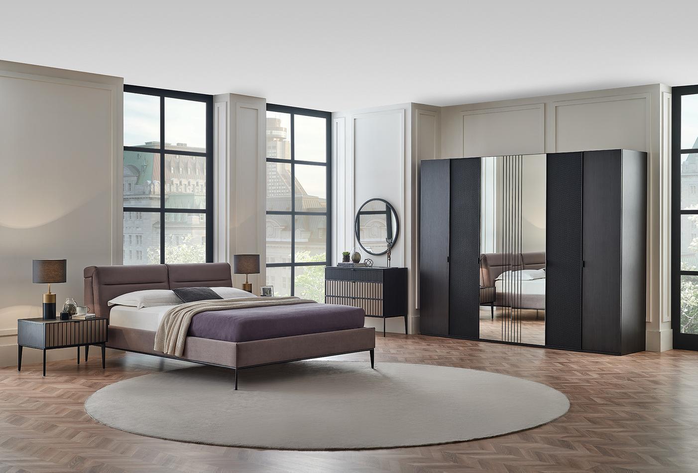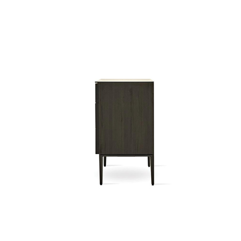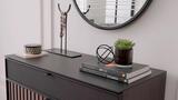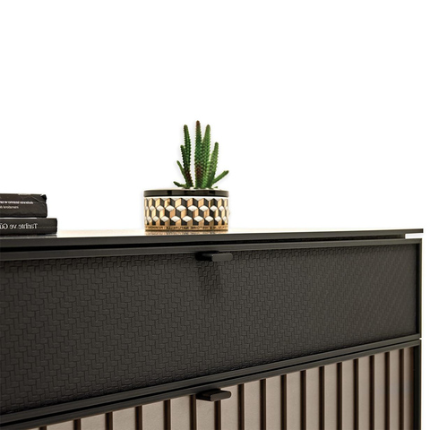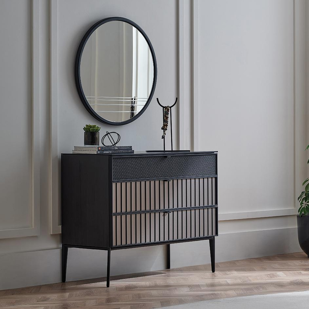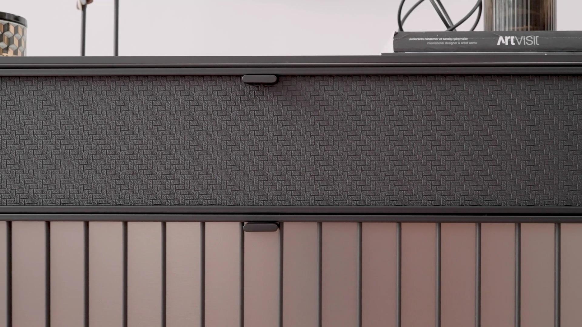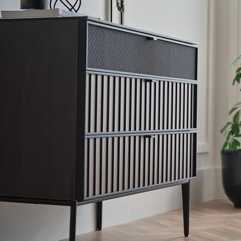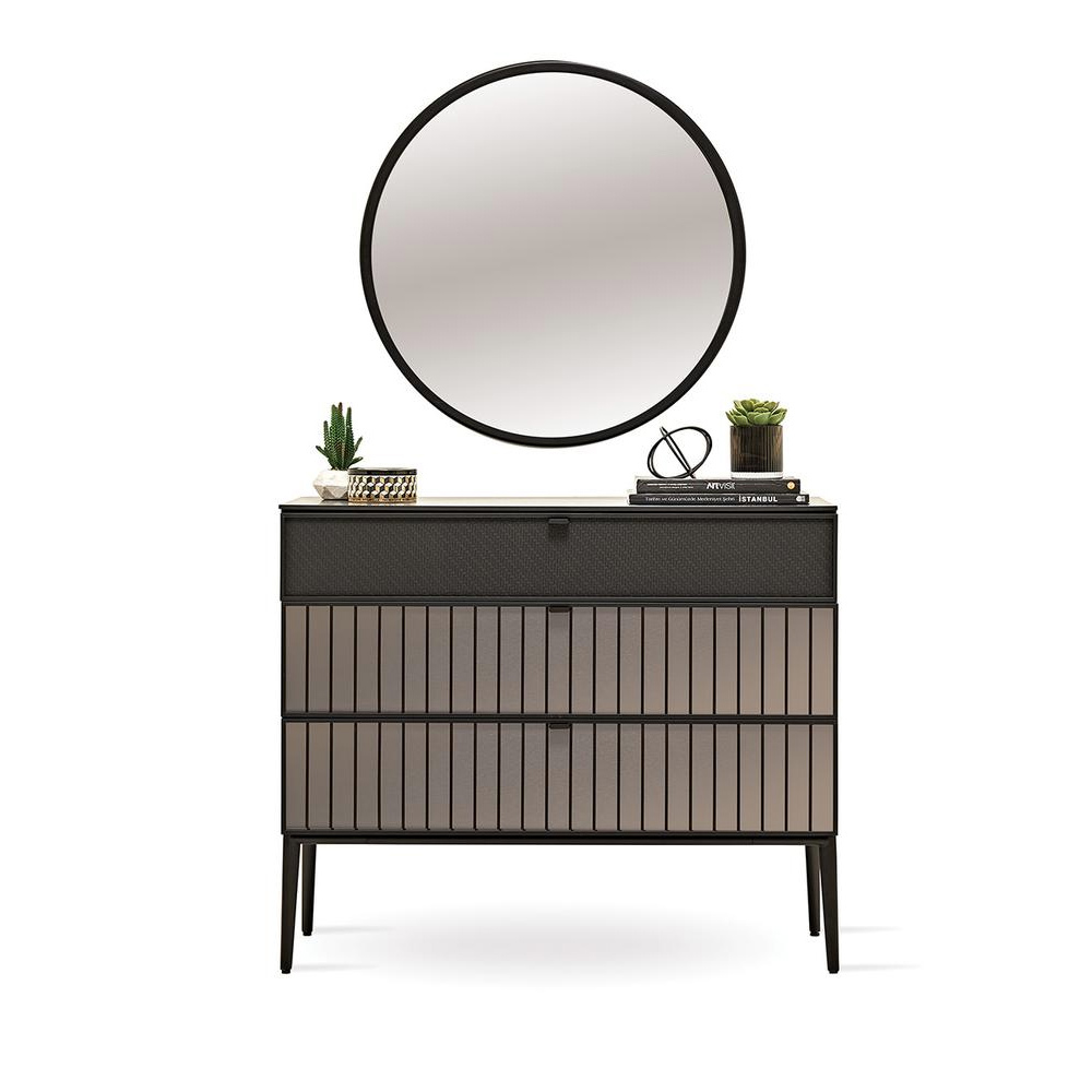 Благодаря сочетанию черной профильной рамы, эффекта металла на корпусе, черных матовых металлических ручек, и кожаным вставкам на поверхности фасада комод подчеркивает элегантность и утонченность интерьера.
