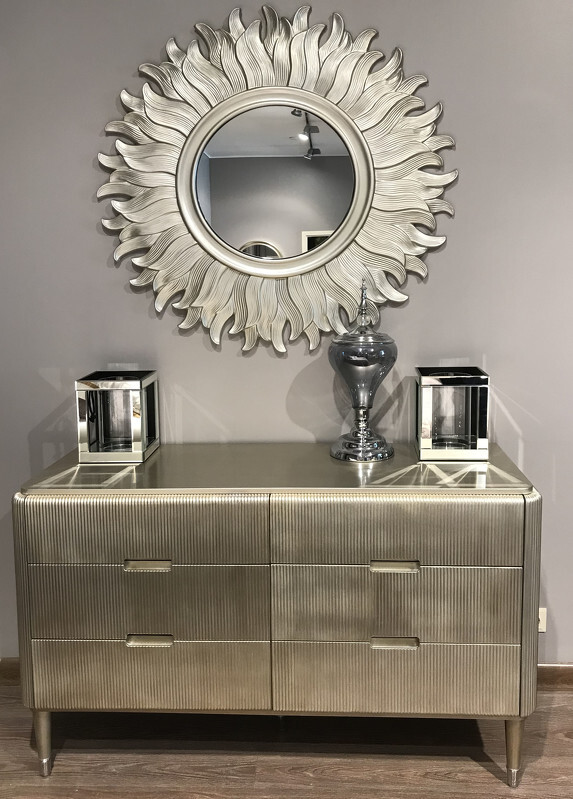 Широкий и вместительный комод от итальянского бренда Fratelli Barri. Закругленная форма и рифленые фасады выглядят очень актуально. Ножки прямые круглые, зауженные к низу. На ножках металлические колпачки. У комода 6 ящиков. Скрытые направляющие. Ручка - выемка на фасаде. Отделка - лак, цвет - патинированное серебро. Выполнен из массива дерева и высококачественного МДФ класса Е1. Цвет фурнитуры - хром. Ящики оснащены доводчиками для плавного закрывания. Дно ящиков декорировано черной бархатной тканью. Корпус ящиков - белого цвета. Данный предмет является частью коллекции Rimini. Вы можете оформить гостиную, столовую, спальню, кабинет и другие комнаты Вашего дома в едином стиле.