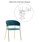 Спецификация: Материал: фанера, пенополиуретан, велюр Материал ножек: сталь Цвет ножек: золотой Размер стула: 56х50х78х48 см Вес стула: 5,5кг Вес комплекта: 22кг Максимальная нагрузка 150кг Поставляется в разобранном виде. В комплекте идёт инструкция и комплект аксессуаров для сборки.