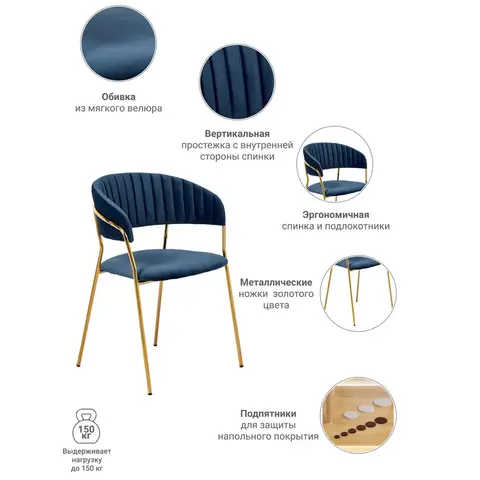 Элегантный контраст создают золотые ножки из прочного металла. Они придают дизайну визуальную легкость и невероятную устойчивость. Сочетание синего велюра и золотого металла делает стулья Turin ярким акцентом в столовой зоне или гостиной.