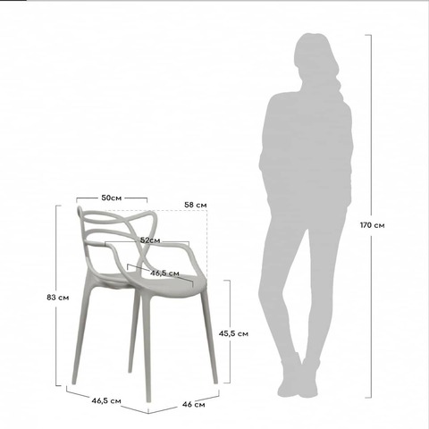 Спецификация: Материал: полипропилен. Размеры, см: Ш52хГ58хВ83 Высота сиденья: 45,5см Расстояние между ножками 46х46,5см Вес: 4 кг Максимальная нагрузка 150кг Штабелируется до 6шт Поставляется в собранном виде. Размер комплекта: 50х75х102см Вес комплекта: 24 кг.