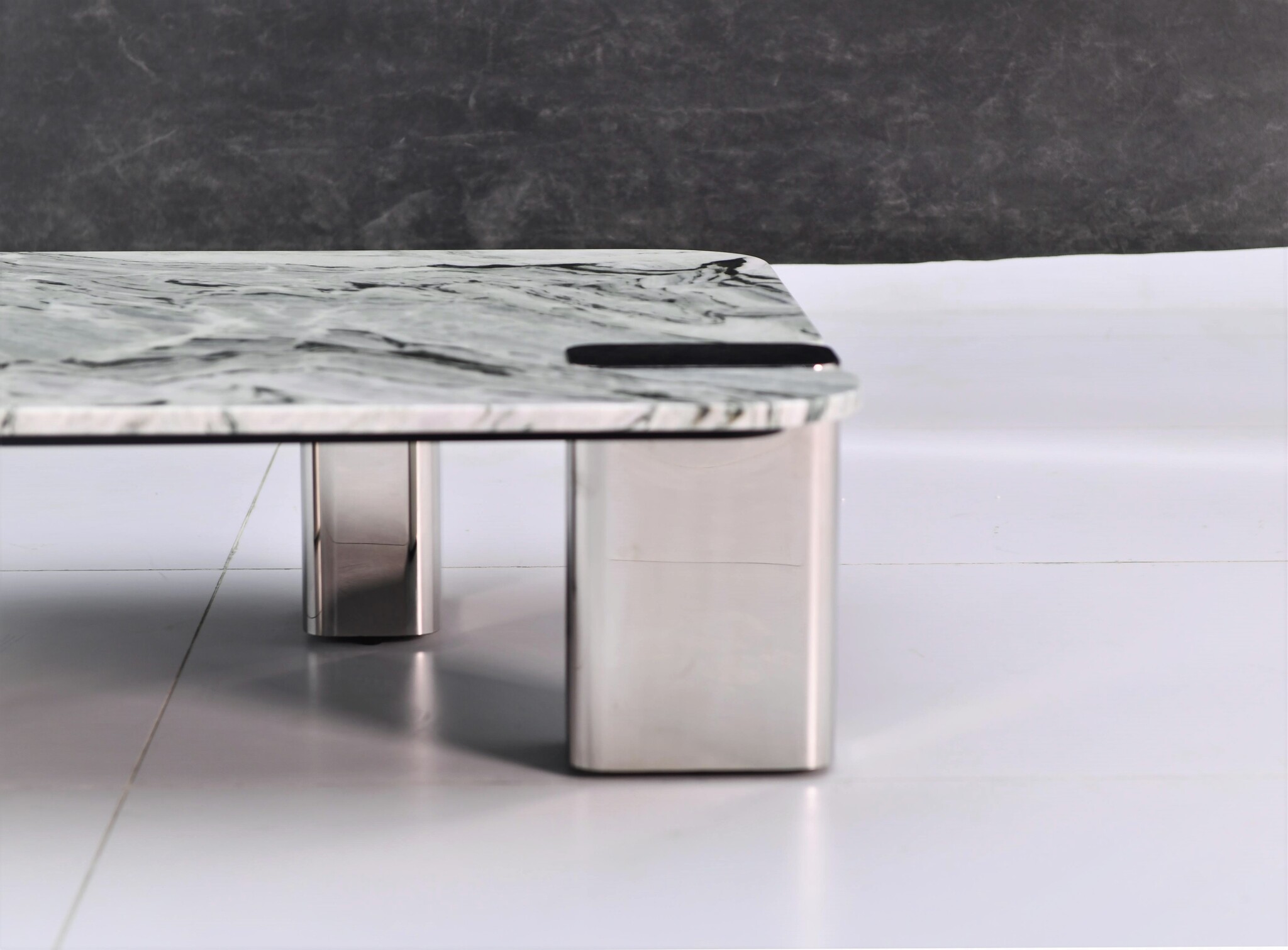 Дизайн столов — это игра контрастов, сочетающая блеск столешницы с приглушённой теплотой металлического основания.