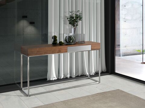 Консоль MN1322 от фабрики Angel Cerda – четкий минимализм с «изюминкой». Консоль MH1322 очарует с первого взгляда всех поклонников минимализма. У этой модели четкая и простая конструкция, практичный и универсальный дизайн, удобный и полезный выдвижной ящик. Все это – безусловные плюсы, которые делают эту консоль нужным предметом интерьера любой городской квартире. Консоль MN1322 имеет прямоугольную форму. Столешница изготовлена из толстой панели шпонированного МДФ (цвет базового фабричного варианта - орех). Ее высота позволяет ставить тяжелые предметы, а природная прочность дерева – гарантия стойкости к ударам. Справа находится выдвижной ящик из нержавеющей стали. Он оснащен доводчиками, прочными металлическими направляющими. Опора имеет рамочную конструкцию, изготовлена из нержавеющей стали. Благодаря прочности материала и поддержке по всему периметру, обеспечивается надежность при эксплуатации и стойкость к высоким весовым нагрузкам. Опора поставляется отдельно. Поэтому потребуется самостоятельная сборка. Крепеж и инструкция входят в комплектацию. Масса консоли составляет 32 кг. Размеры: длина – 135 см, ширина – 40 см, высота – 76 см. В коллекции корпусной мебели Angel Cerda присутствует журнальный столик MH1322A с аналогичным дизайном. Потребуется самостоятельная сборка. Крепеж и инструкция в комплекте.
