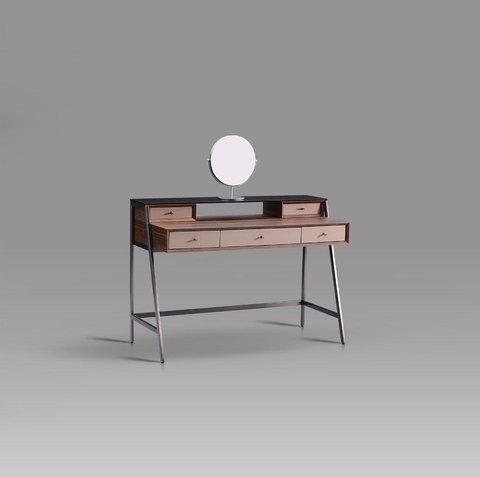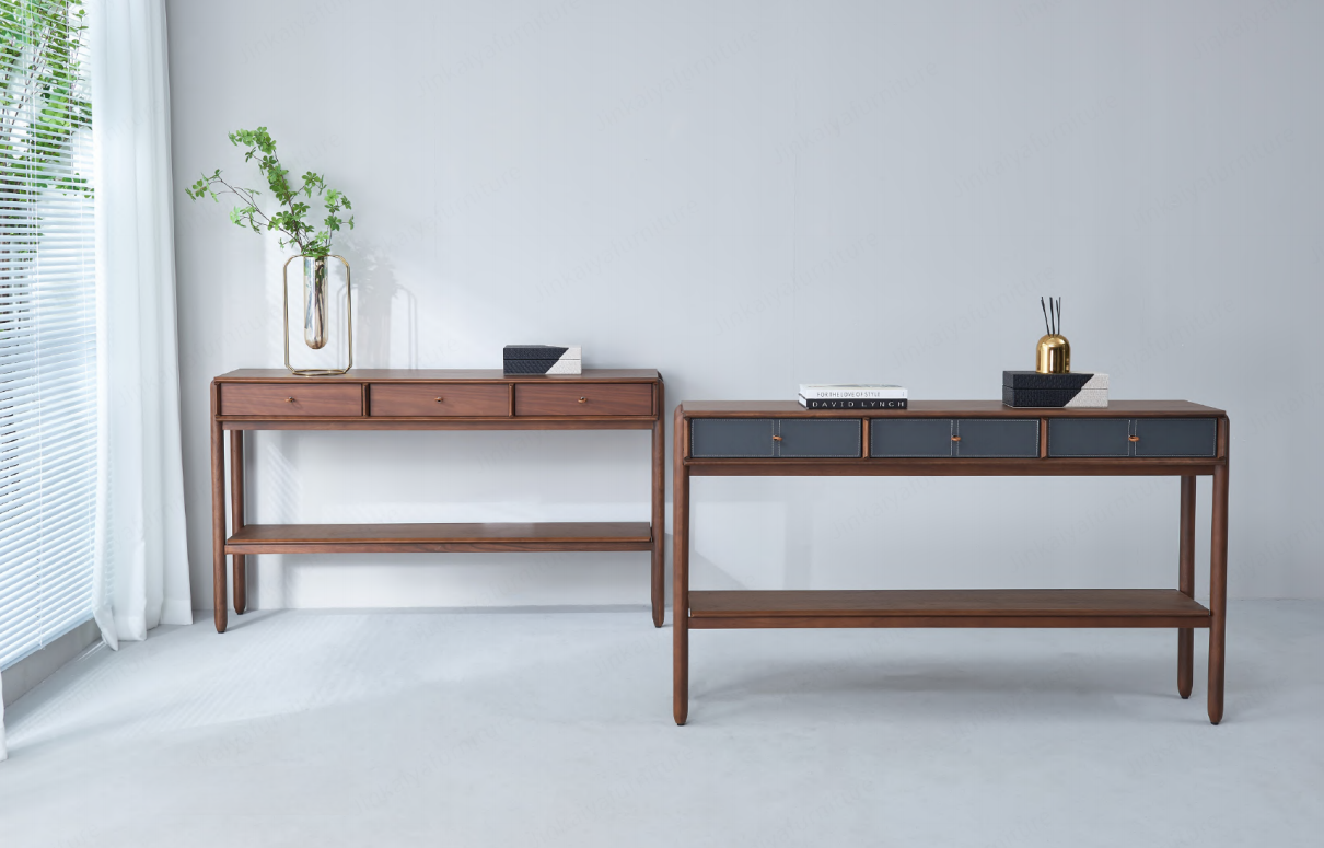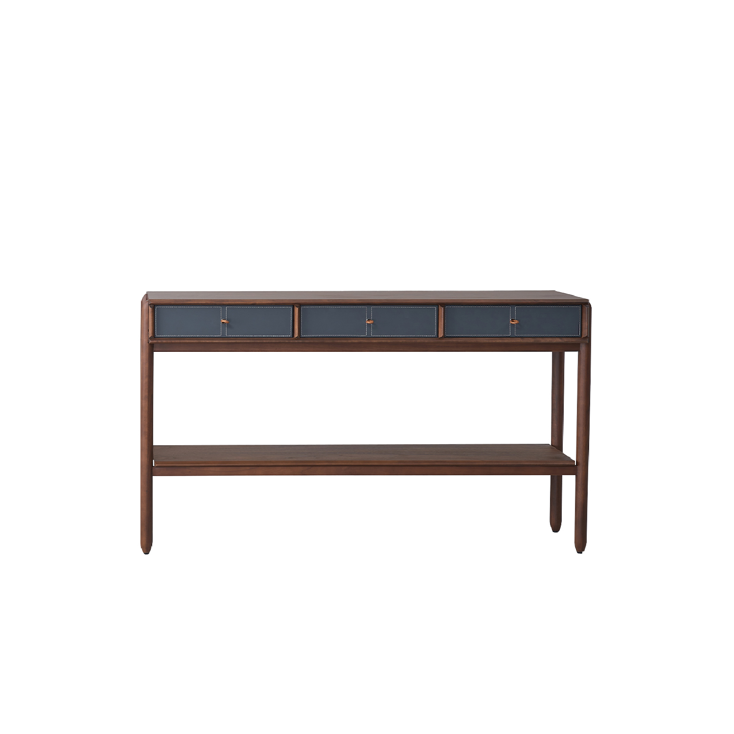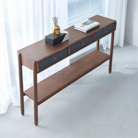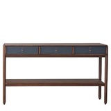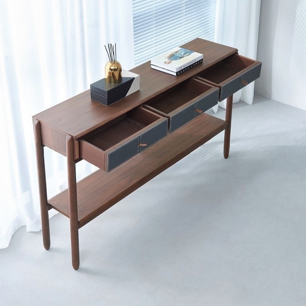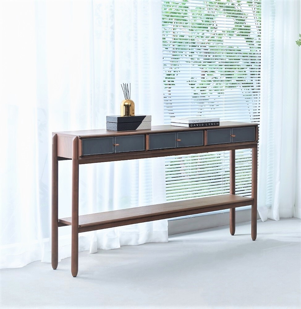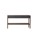 Консоль представлена в отделке из экокожи серо-синего цвета и шпона американского ореха.