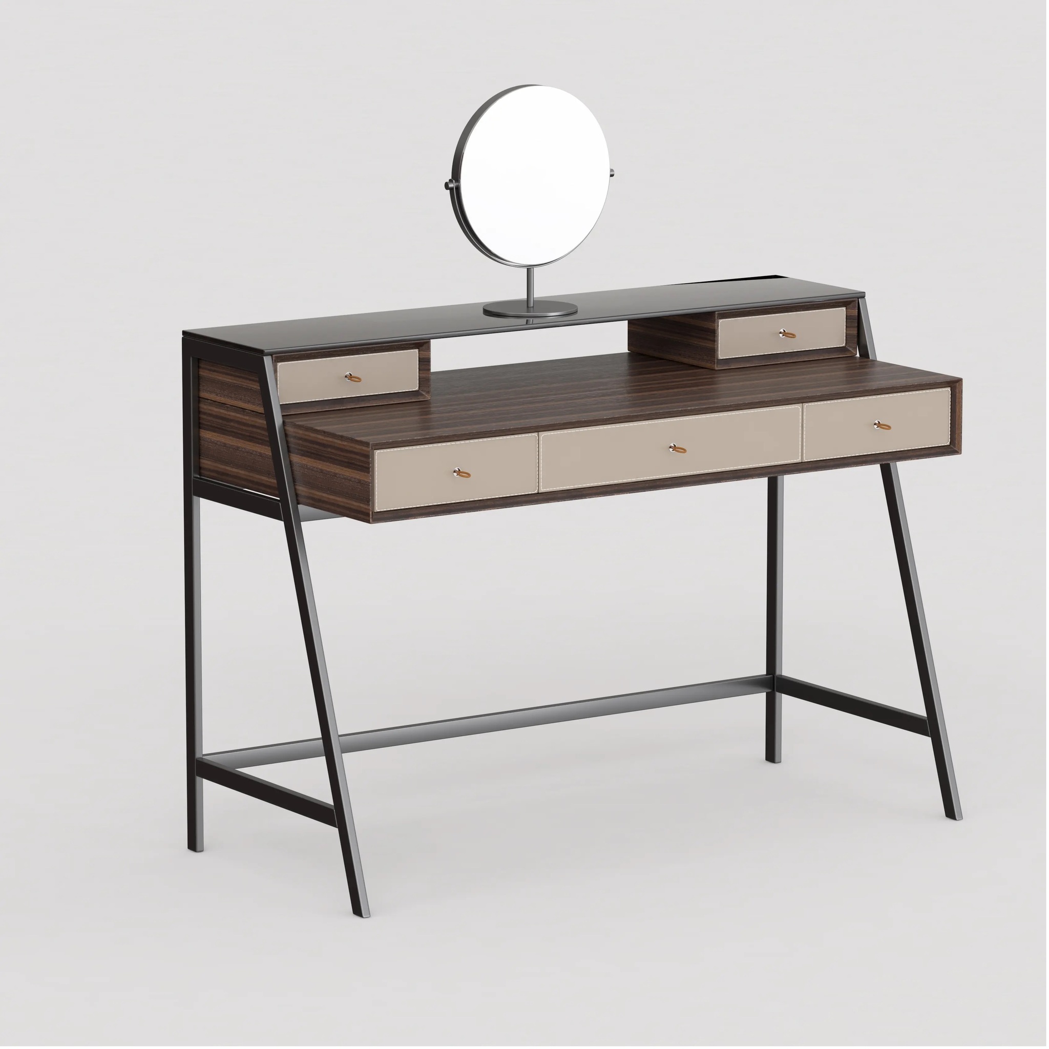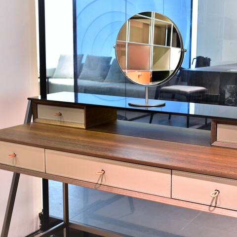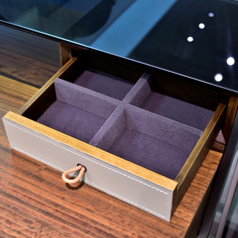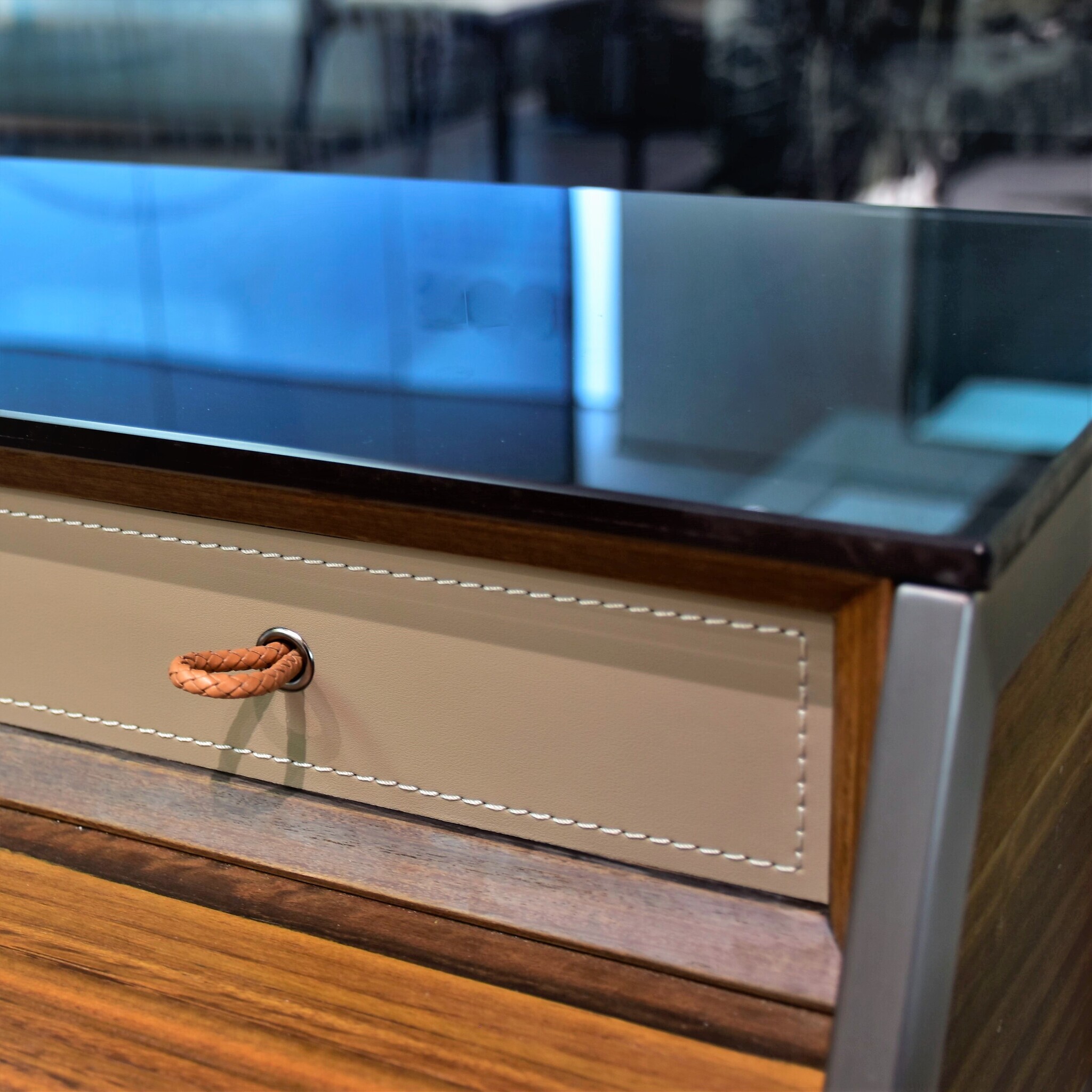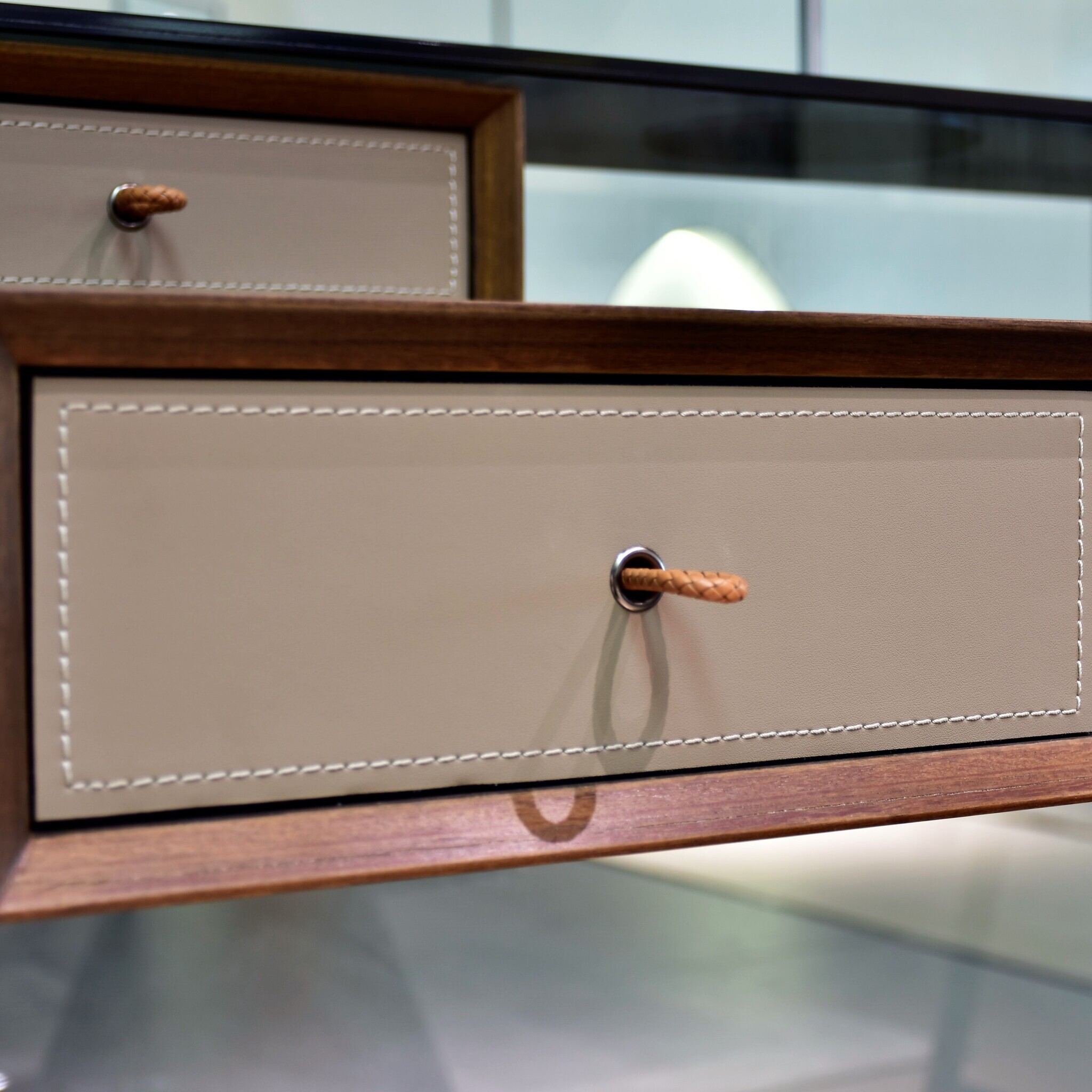 Консоль в отделке из экокожи, натурального шпона и массива эвкалипта, сочетающая в себе высочайшее качество изготовления и современный дизайн. Верхняя полка черная, лакированная. Ножки из стали подчеркивают строгую элегантность консоли. Выдвижные ящики оснащёны механизмом плавного закрывания.Уникальные ручки-петельки из экокожи придают консоли очаровательный вид.