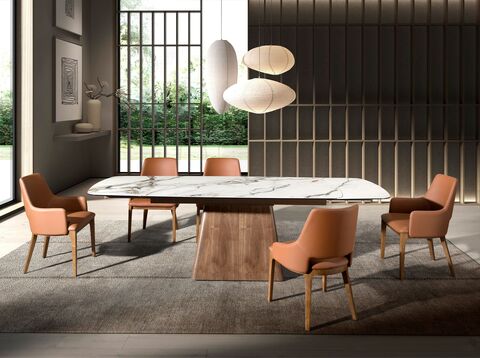 Стул с подлокотниками в современном дизайне с сиденьем и спинкой, обитыми коричневой кожзаменителем. Его натуральные деревянные ножки, шпонированные орехом, с авангардным, но неподвластным времени стилем сделают его обязательным для вашей кухни или столовой. Этот стул от Angel Cerdá сочетает в себе уникальный и индивидуальный стиль бренда, а также максимальный комфорт и устойчивость благодаря высокому качеству обивки и оригинальной конструкции ножек.